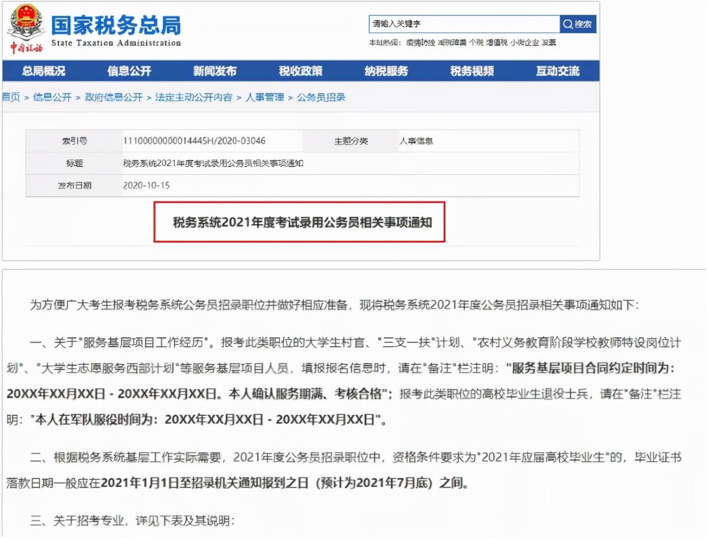 2020年10月份,国家税务总局发布《税务系统2021年度考试录用公务员相关事项通知》