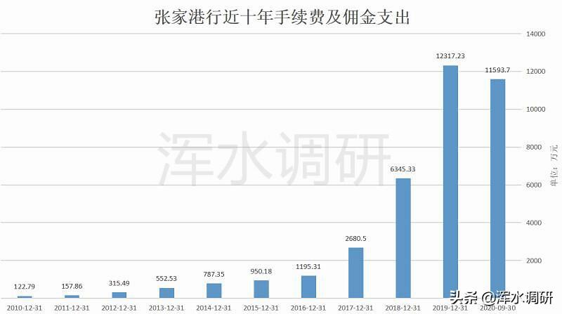 事实上,张家港行的手续费及佣金支出在近几年呈现大幅增长,如2019年增长94.11%,今年前三季增长31.81%,都高于收入增幅,这种长期剪刀差的结果就是导致净收入大幅下滑。