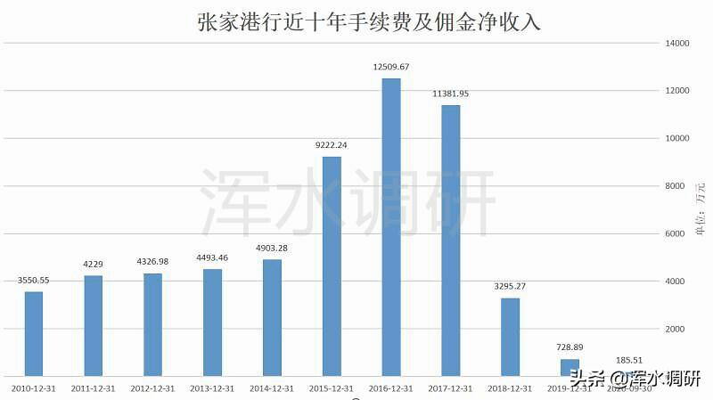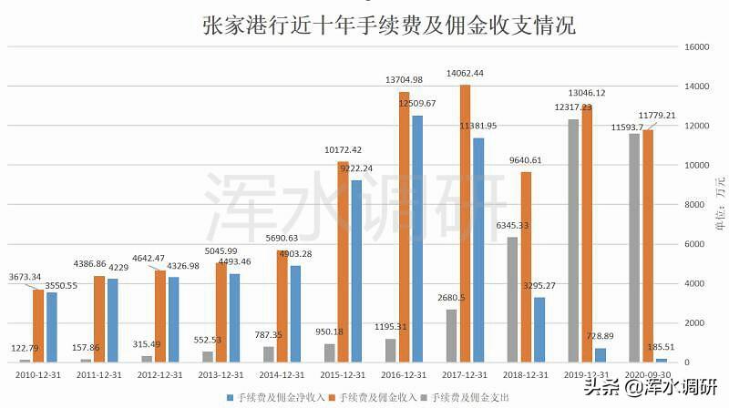 数据显示,张家港行的手续费佣金收入在2019年和今年前三季的增幅都超过30%,只有在2018年是收入下滑了31.44%。