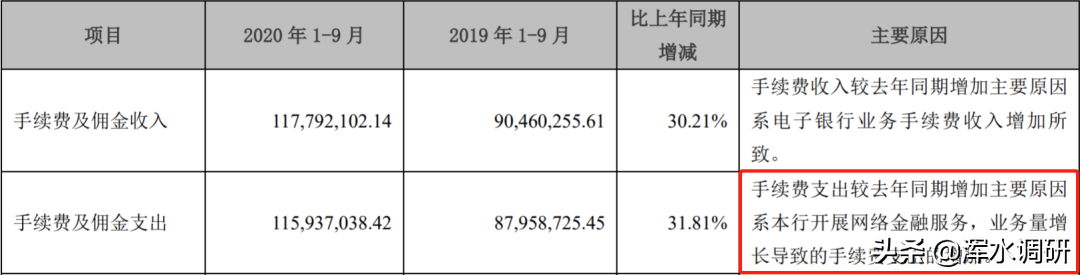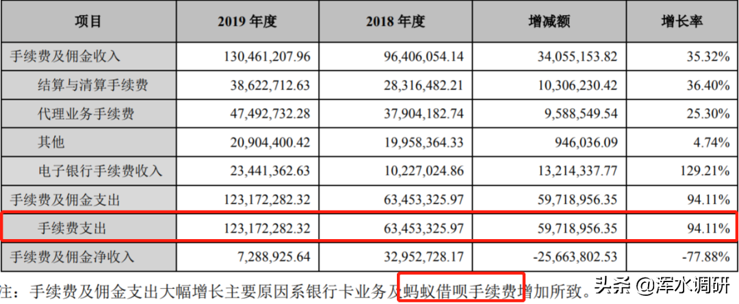 从2018年和今年三季报中,这些手续费支出主要来源于“新开展的网络金融服务”,2019年年报中披露为“系银行卡业务及蚂蚁借呗手续费增加”。