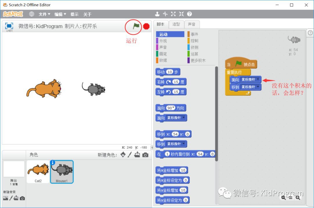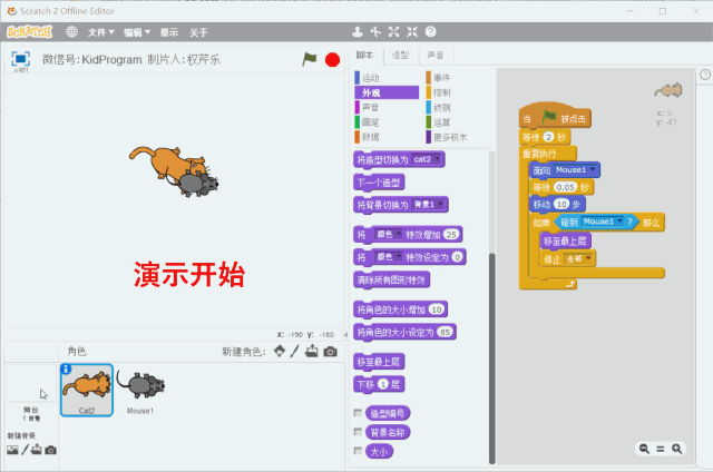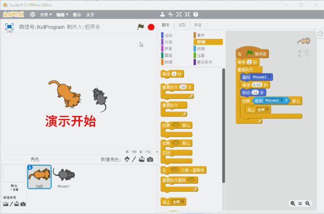 我们修改了2处,第一,是在程序开始后等一段时间,给老鼠提前准备的时间;第二,在循环积木内部,面向老鼠后不是直接跟着积木 [移到 老鼠角色] (因为这个积木会立即让猫移动到老鼠跟前,导致程序结束),而是等待极短的时间然后只移动少量几步。