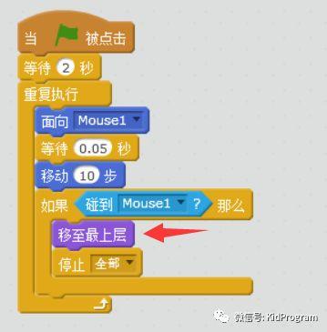 当猫捉到老鼠时,把猫的角色往上层移动。(如果你已经记不清“层”的概念,请查阅公众号底部菜单“Scratch编程手册”中,关于“外观”积木的文章)
