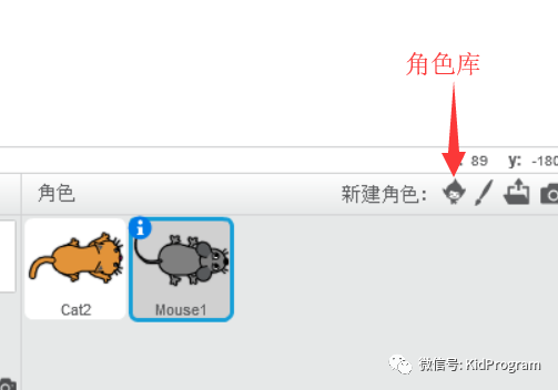 打开Scratch,出现默认的白色舞台和小猫角色。你可以直接使用这只黄色小猫。也可以像我这样,删除它,从“角色库”选择另一只小猫,然后,添加一只老鼠。