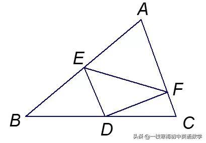 例2、如图,△ABC中,E、F分别在AB、AC上,DE⊥DF,D是中点,试比较BE+CF与EF的大小.