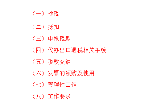 抄税、抵扣申报税款、代办出口退税、税款缴纳、发票的领用及使用