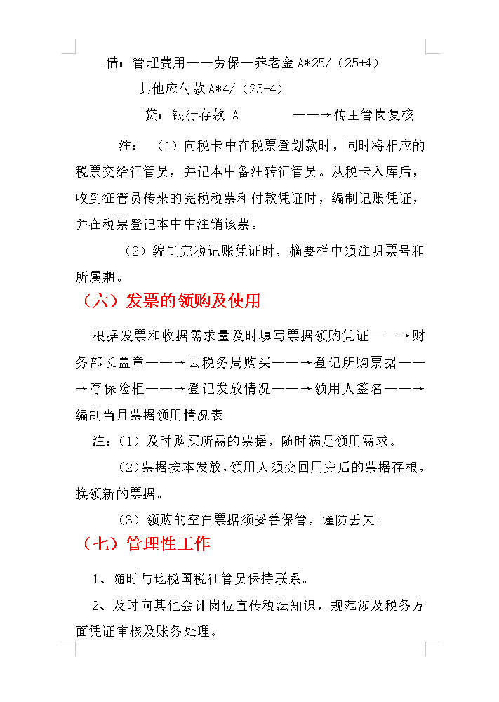 填写付款审批单——→财务部长审批——→填写进帐单,连同税票和付款审批单交出纳办理银行结算手续——→登记资金计划表——→签收出纳传来的银行进账回执——→在税票登记本中注销相应的税票——→编制凭证