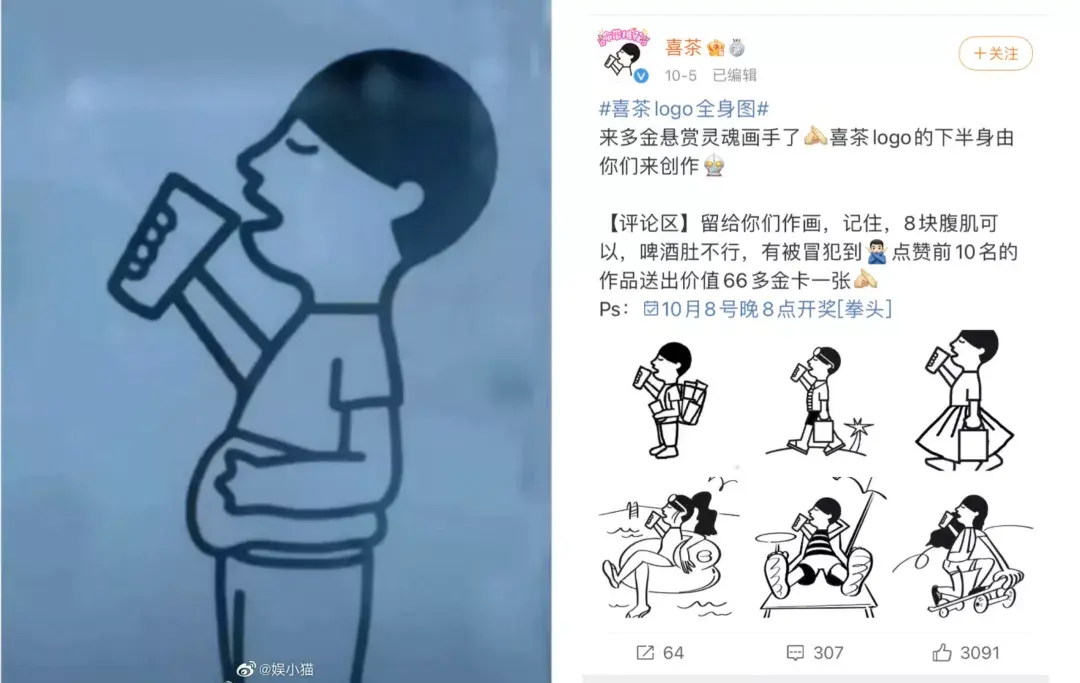 嗅到这股舆论风潮的喜茶,很快就在微博上给予回应 —— 在发布官方全身照后,面向全网发起logo下半身的创作邀请。唯一“规定”是啤酒肚不行(但八块腹肌可以),以耍点小脾气的方式,赋予了品牌的人格个性。