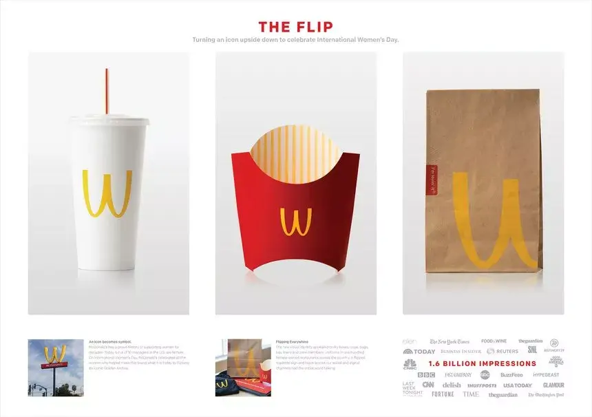 #结合形状做延展# 喜茶这次超级符号的创意,就是基于logo图形做的延展。除此之外,比如麦当劳在妇女节期间,把“M”翻转过来变成“W”,呼应“Women's Day”。小小的变化收获热议与认可,可以说是四两拨千斤。