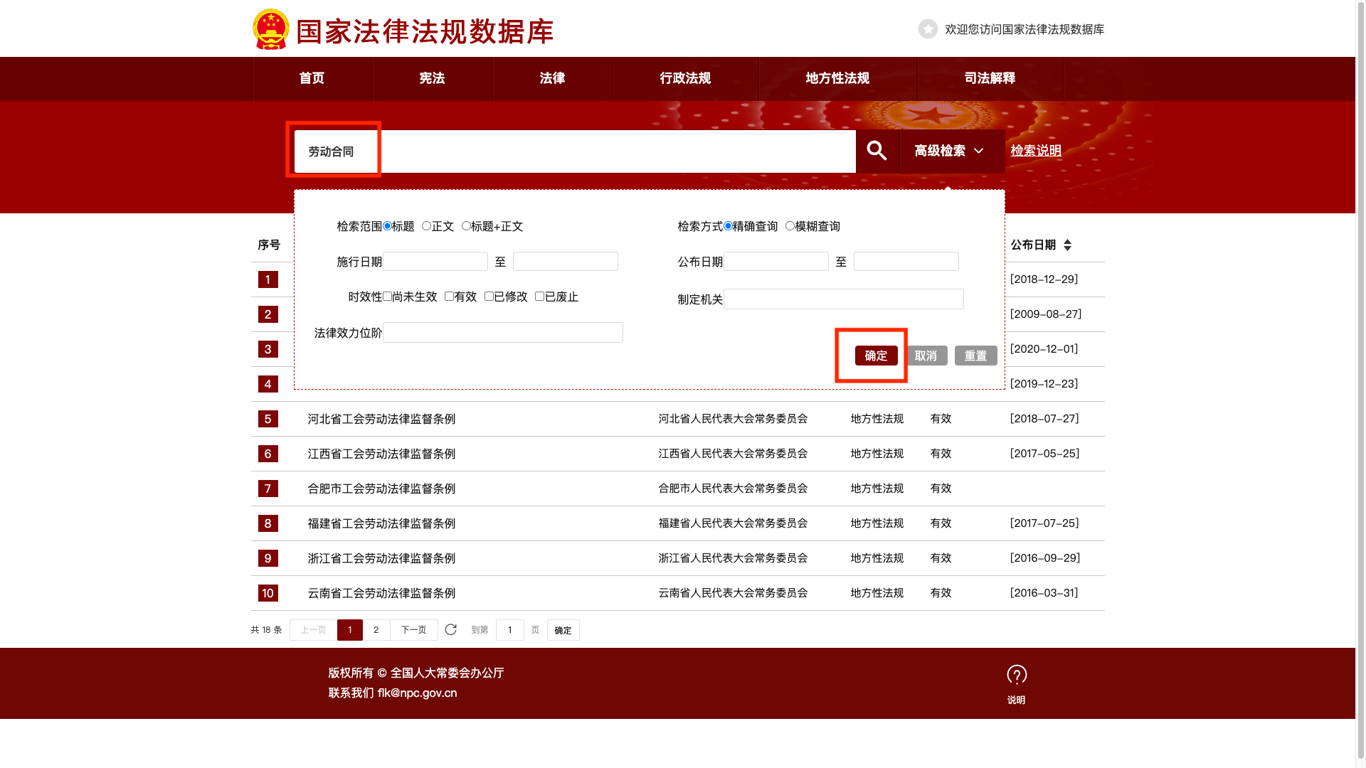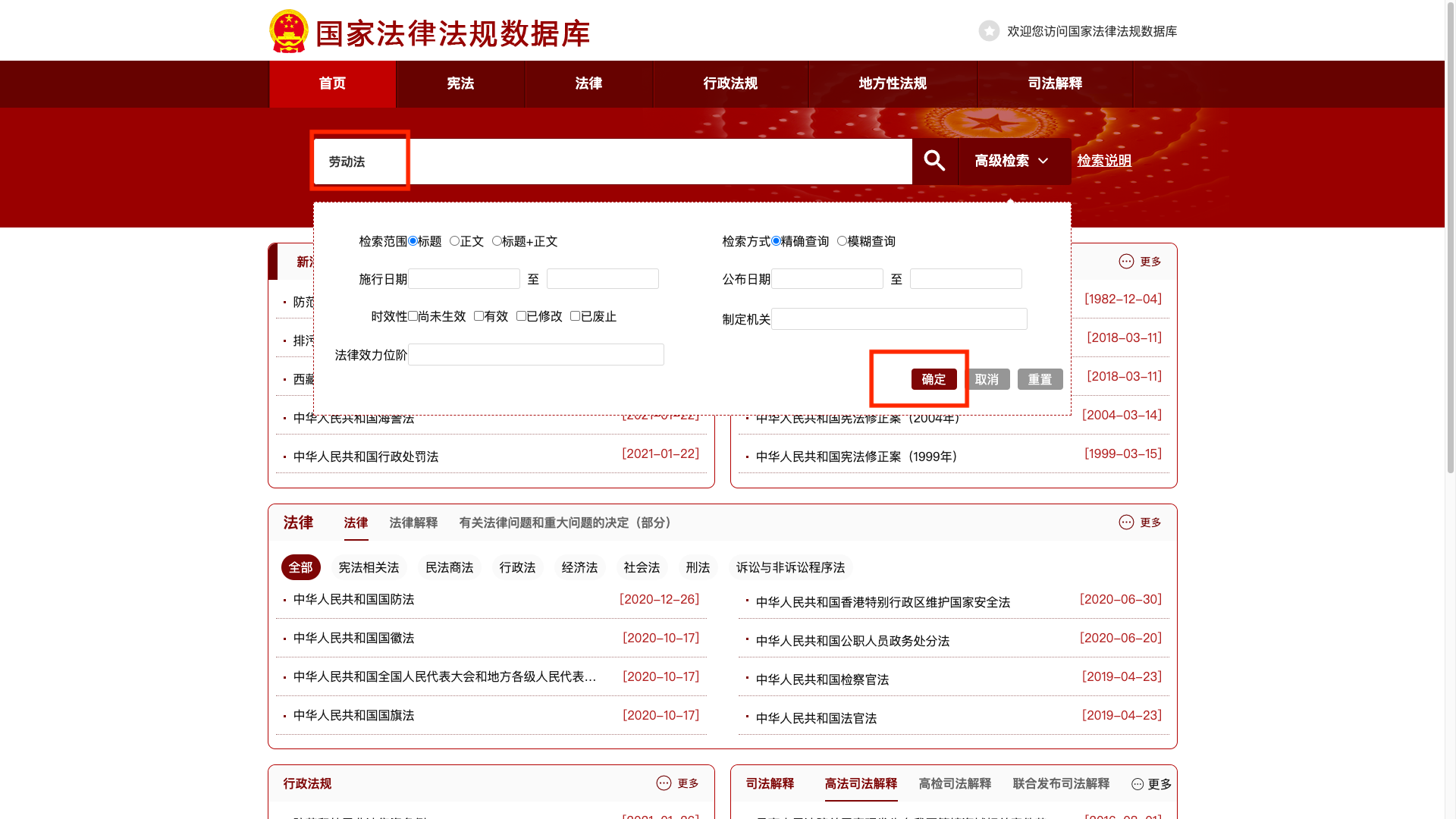 搜索劳动法关键词后,会弹出两条法律,但是绿色框框住的是“现行有效”,我们直接以此为准即可。黄色框框住的是“已修改”,说明这个是被修改了,修改后的结果就是上面的第一条“现行有效”的。