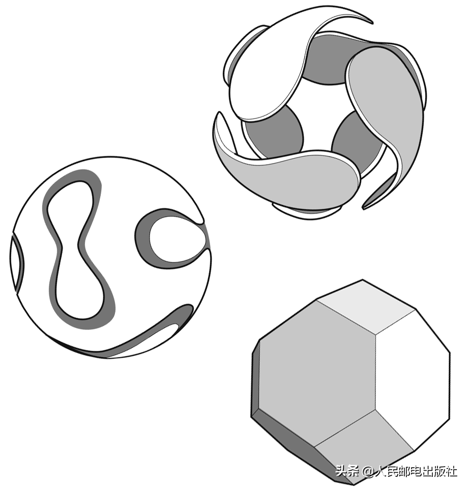 那么,我们如何才能制造出完美的球体呢?在 2006年德国世界杯筹备期间,制造商就宣称他们做出了世界上最圆的足球。足球通常是用几片平面皮革缝制而成的,人类所制造的许多足球都是将自古以来探索出的各种形状进行拼贴组合而成。要了解如何制造出最匀称的足球,我们可以先来看那些使用单一对称形状的皮革制造出来的“球”,这些对称形状的皮革经过特别排列后,要使最终成形的球体形状是匀称的。为使足球尽可能地匀称,每个顶点所连接的面的数量都应该是相同的。实际上,这些形状就是柏拉图在他于公元前 360年编著的《蒂迈欧篇》(Timaeus)中探索的形状。