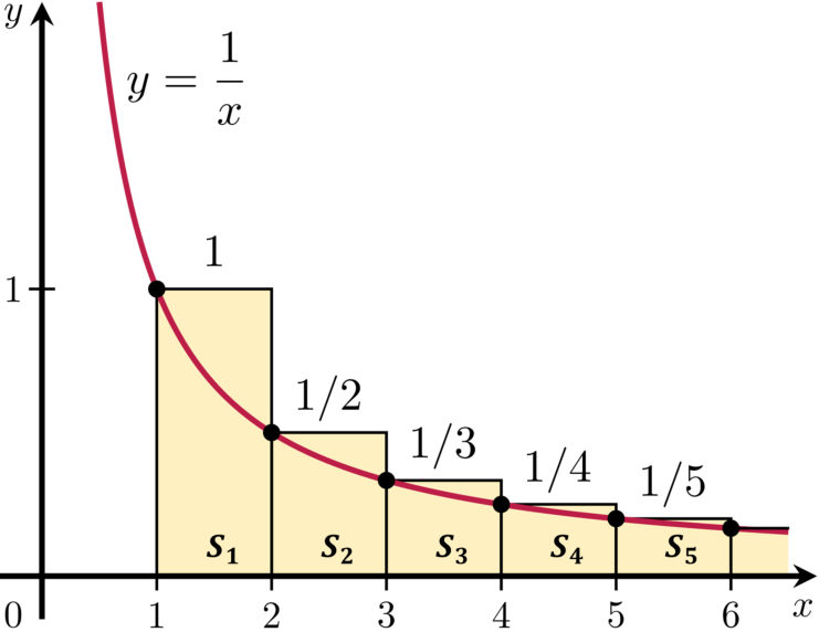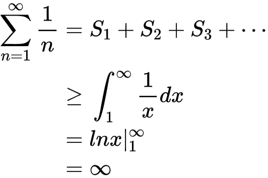 暇积分方法则图中直方图的面积之和即为调和级数。而这些直方图的面积之和大于相应区间内曲线下的面积,而曲线下的面积可以用积分公式求得:
