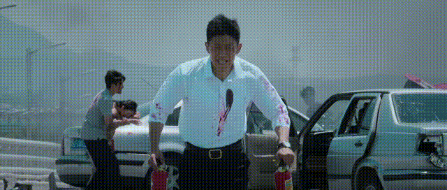 张黎真正的伏笔还在后面:在车祸事件的最后,一辆车忽然冲过来,duang一下撞在别的车上,一名男子浑身血迹倒出车外。