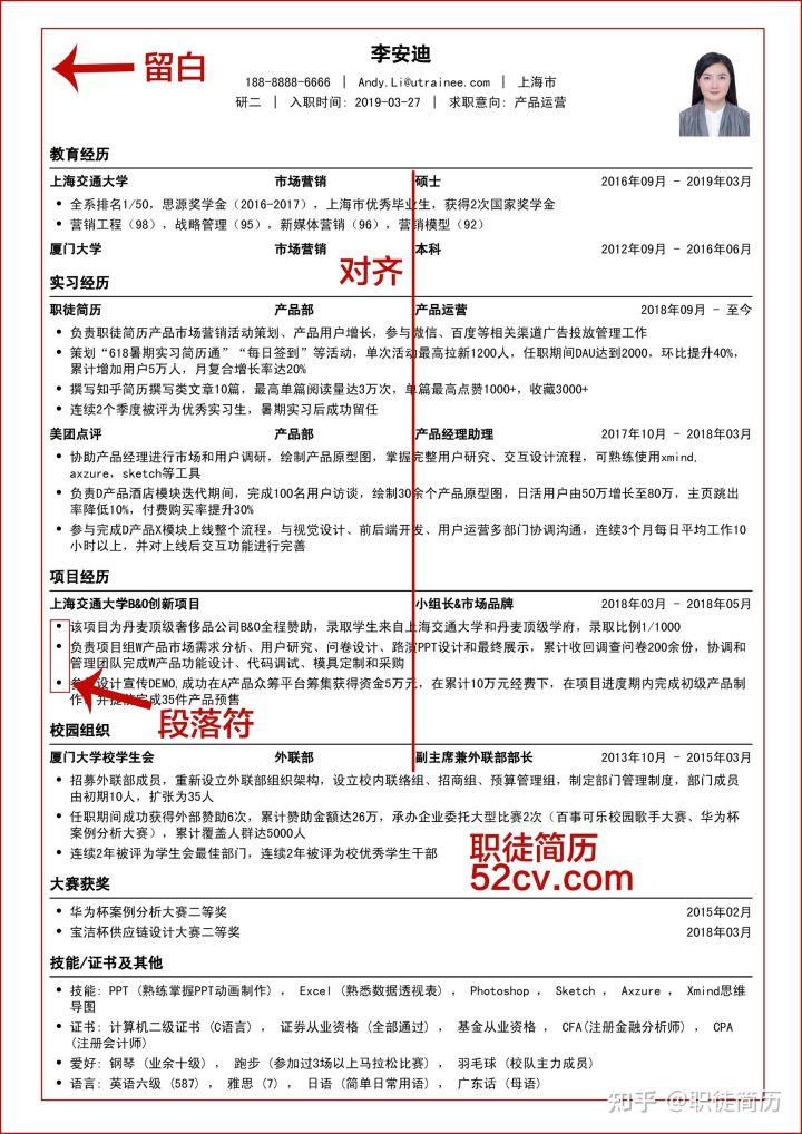 永远记住,简历上最夺眼球的应该是你想重点突出的经历内容,而不是花哨的色彩。因此在设计上,简历的背景可以统一设置为白色,校徽、校训以及其他多余的图标都不需要,更不要画蛇添足增加一个自认为很有设计感的简历封面。