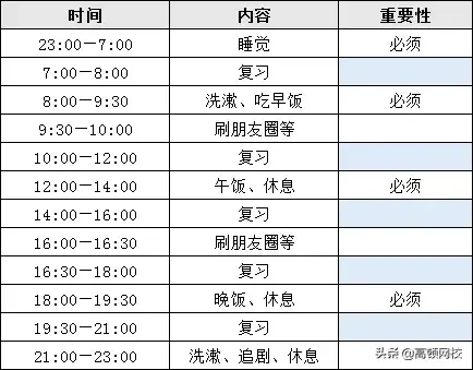 那么在家复习的时候,睡、玩这两项的时间支出就会不自觉增多,哪怕一项增加1小时,一天的复习时间就会减少两小时。所以,考生先回忆一下自己一天的时间流程,制成表分析自己每天的时间分配问题。