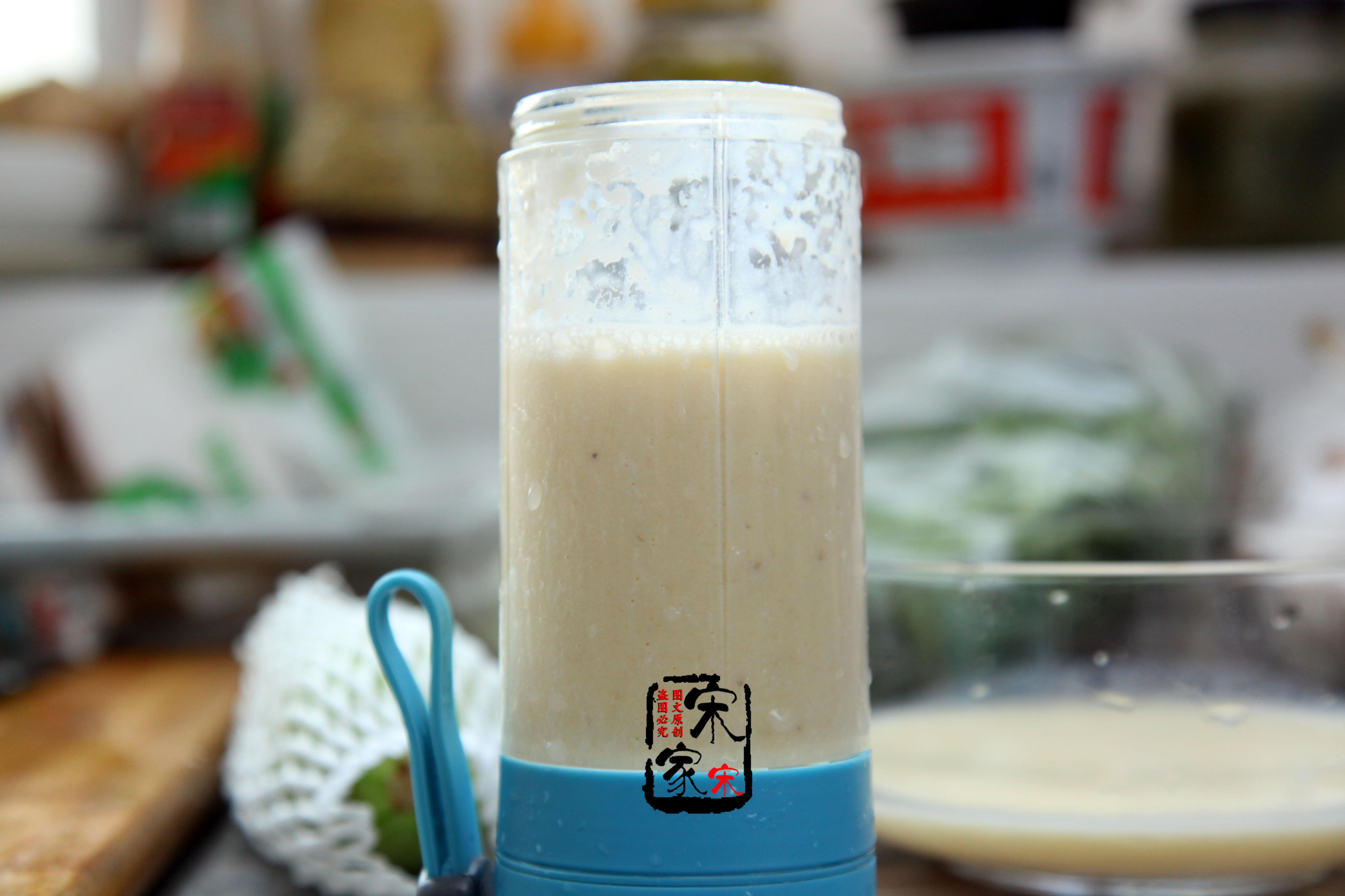 第二步:把食材放进榨汁机里打碎。如果没有榨汁机,可以先把牛奶温一下,然后放入白糖搅拌融化,,把香蕉放进一个干净的塑料袋里,扎紧口,用擀面杖干成香蕉泥。最后再倒进牛奶里即可。