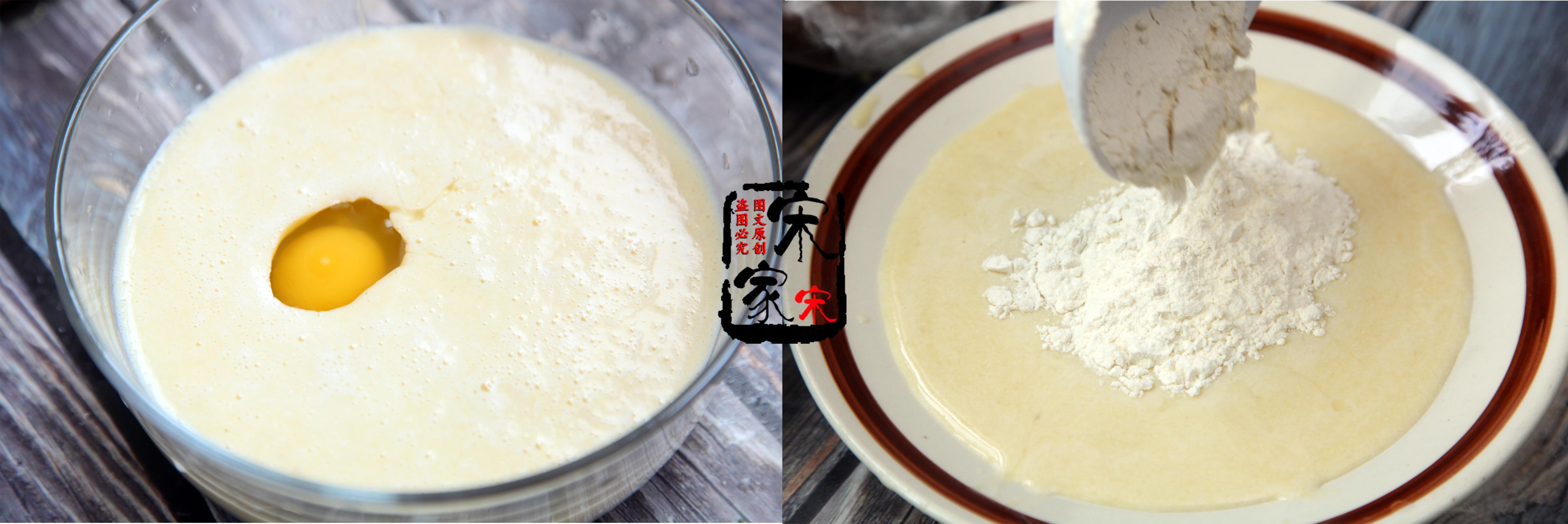 第五步:不粘锅小火烧热,锅底可以刷上一层食用油,可以不放油。宋宋没有放。直接舀上一勺面糊倒在锅底。