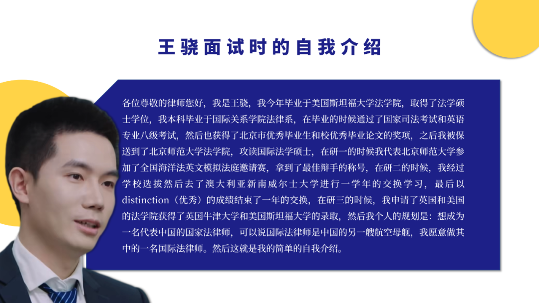 而王骁的自我介绍虽然缺乏实习工作经历,但他聪明地扩充了自己在校的所获奖项与实践活动经历,着重突出自身在校的优异成绩,于是,他凭借着简(fan)单(er)的(sai)自我介绍得到了面试官的赏识。