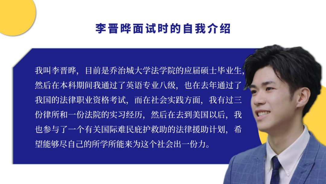 李晋晔的自我介绍仅简短的139个字,但表述层次分明,仪态自信大方,再加上优秀的外表条件,因此他获得了面试官的青睐。