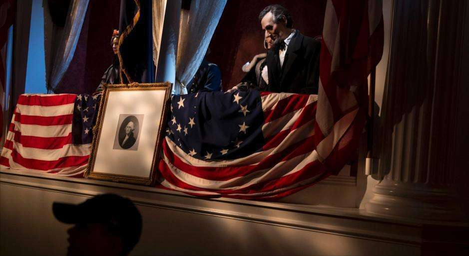 等到全场因为剧情而大笑的时候,布斯冲了进去,开枪击中林肯头部,布斯高喊「这就是暴君的下场!,南方的大仇已报!」,然后往外匆忙地跑。林肯在生死边缘痛苦徘徊了几个小时,最终还是离开了人世。