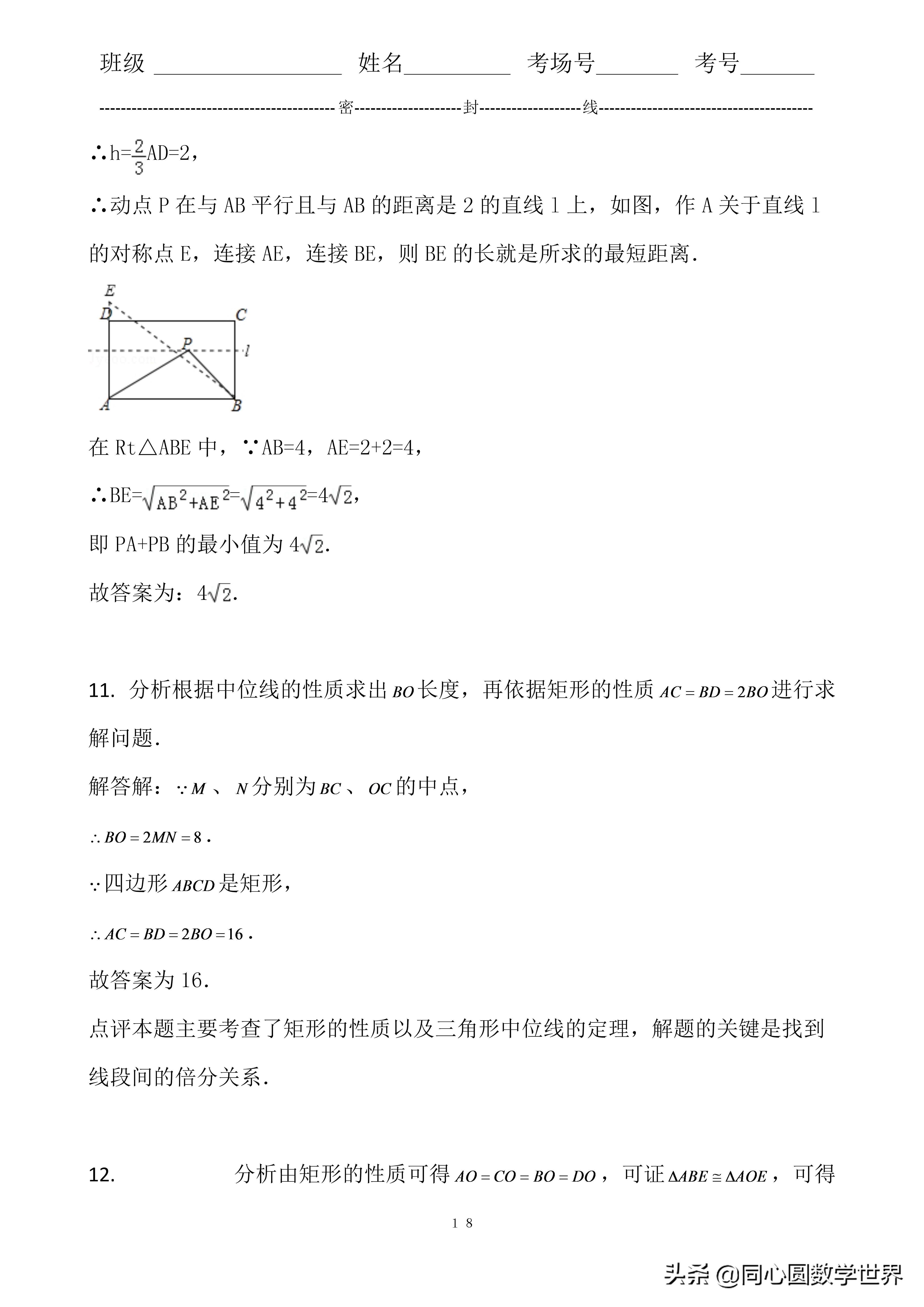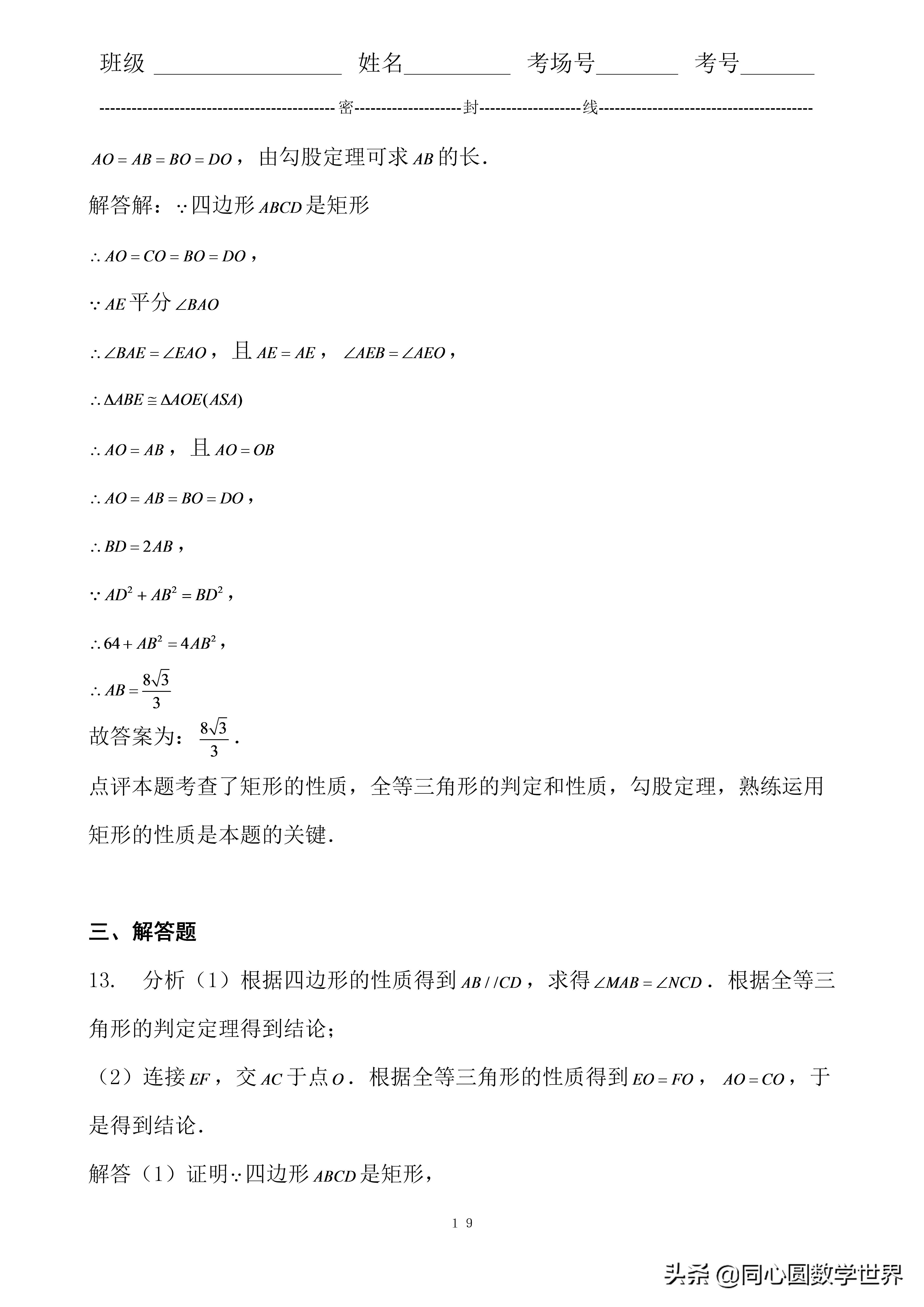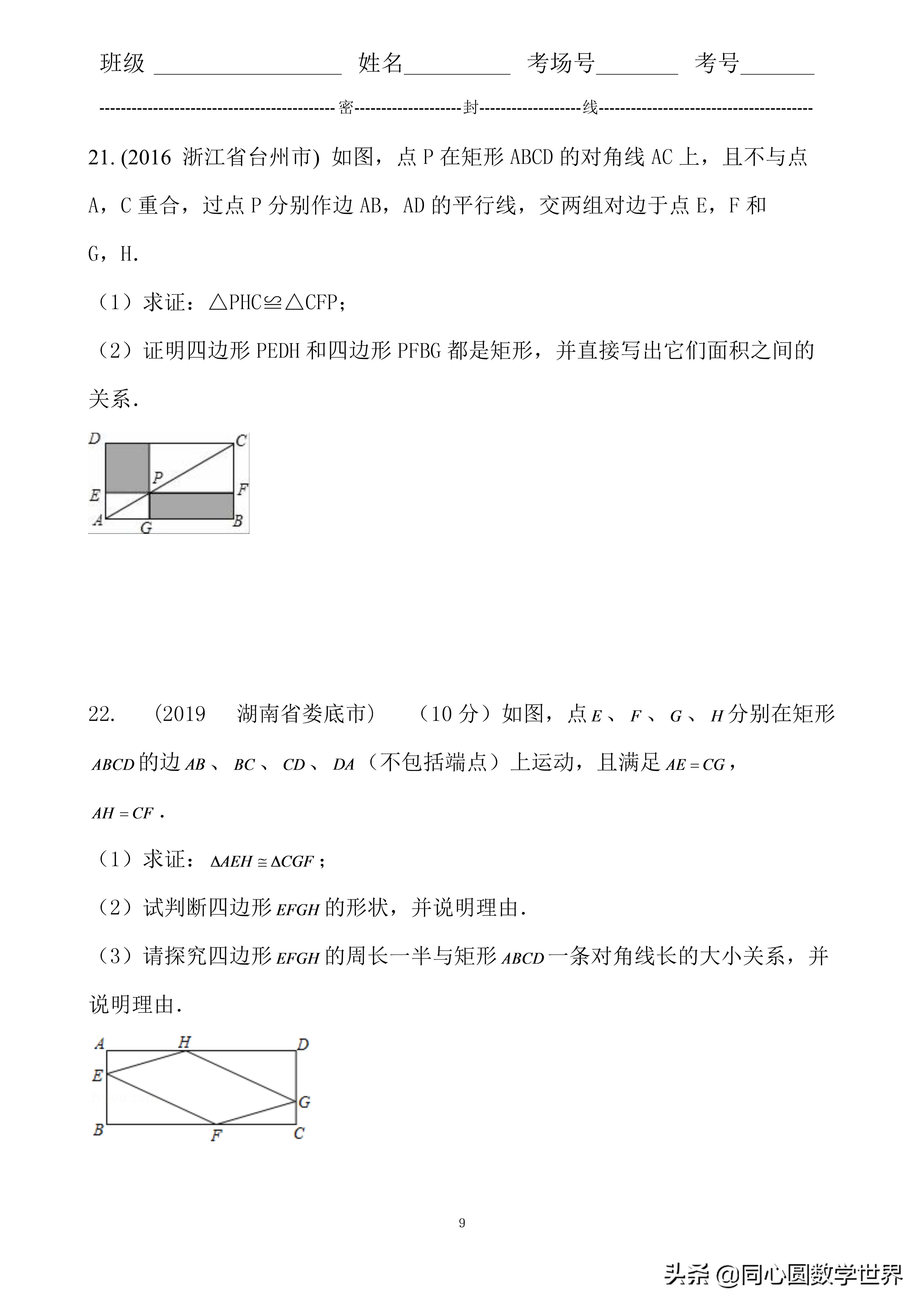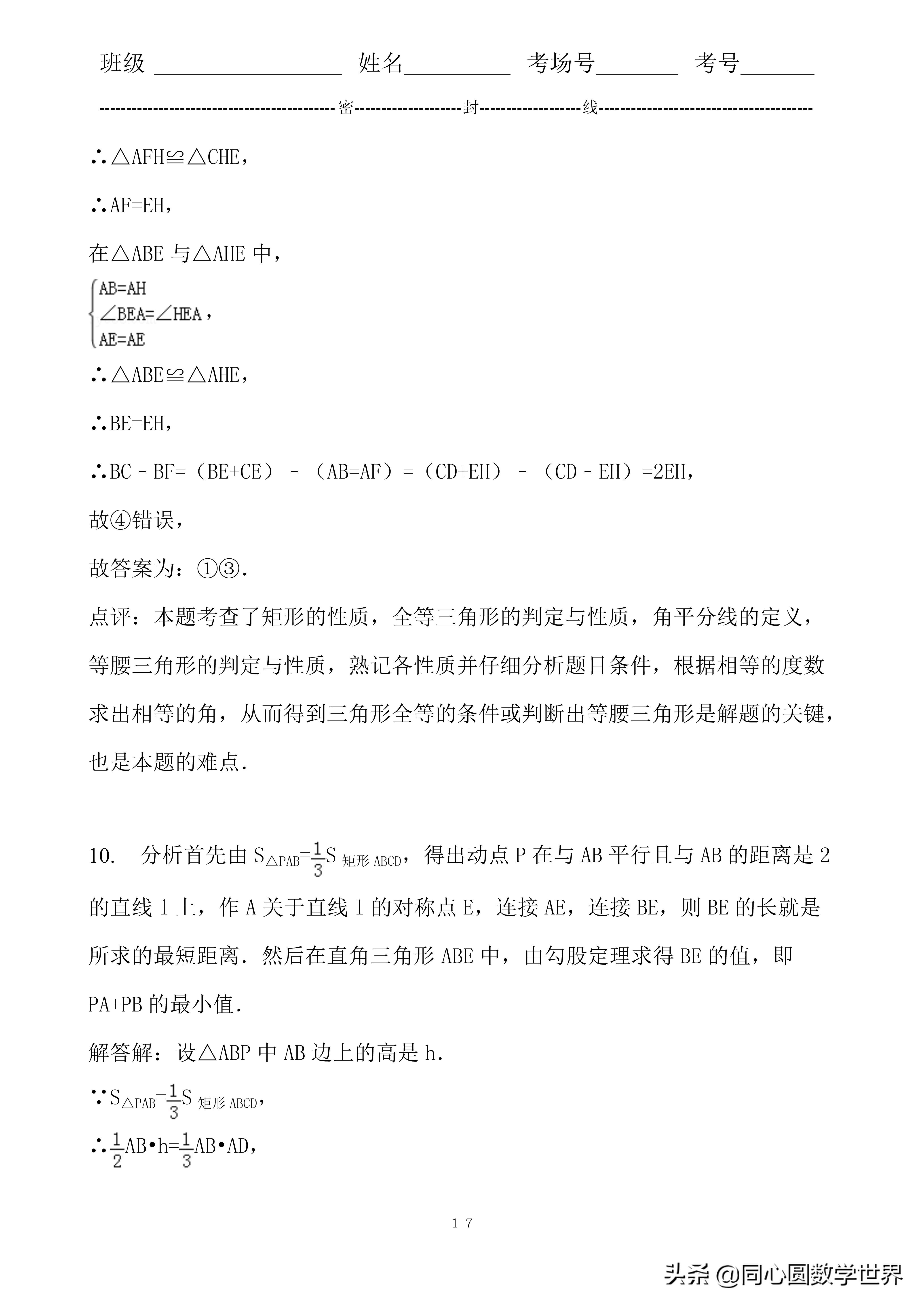 第9题则从矩形的性质,全等三角形的判定与性质,角平分线的定义,等腰三角形的判定与性质等方面进行了知识考查,熟记各性质并仔细分析题目条件,根据相等的度数求出相等的角,从而得到三角形全等的条件或判断出等腰三角形是解题的关键,也是解决与矩形有关的问题的难点。