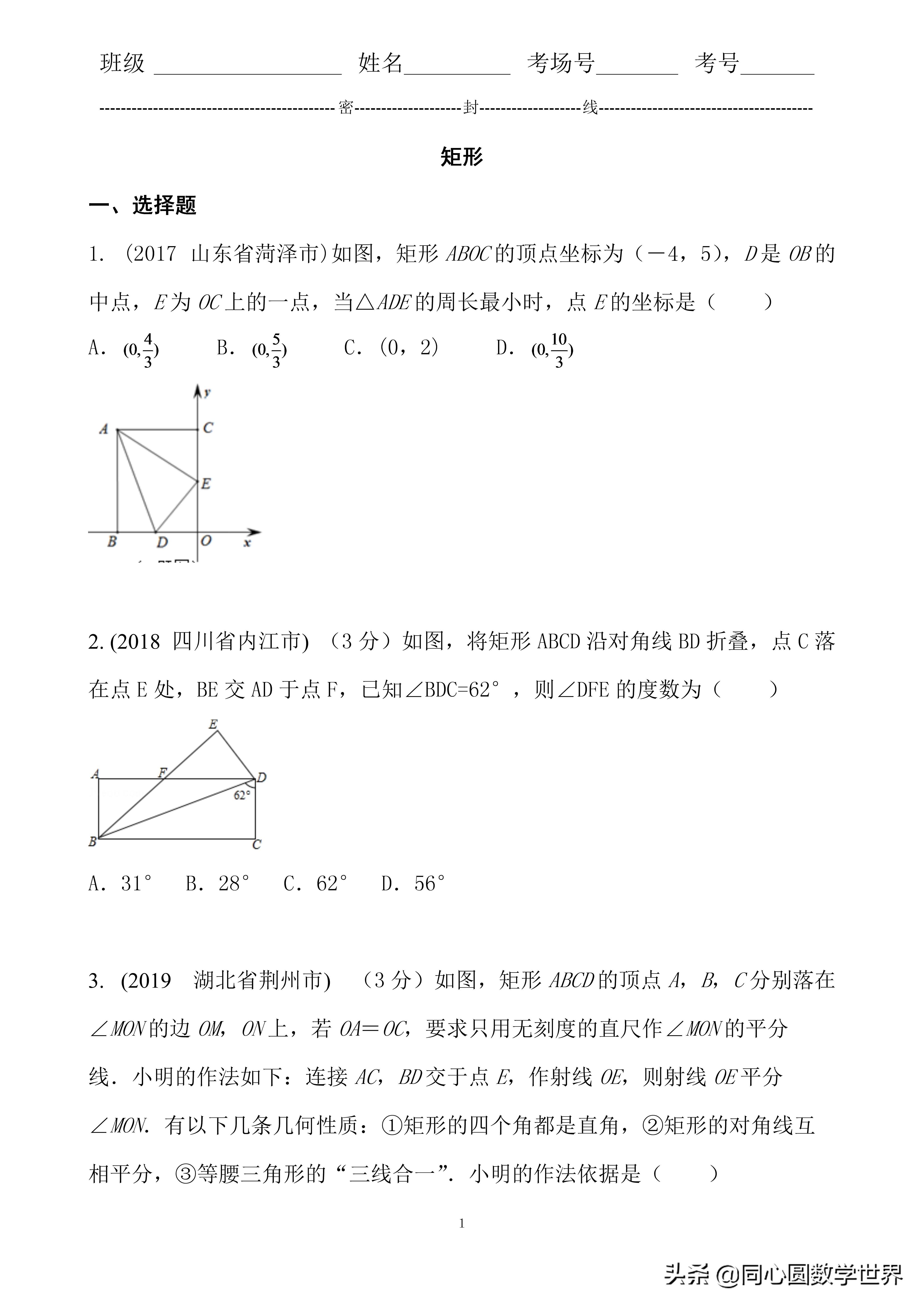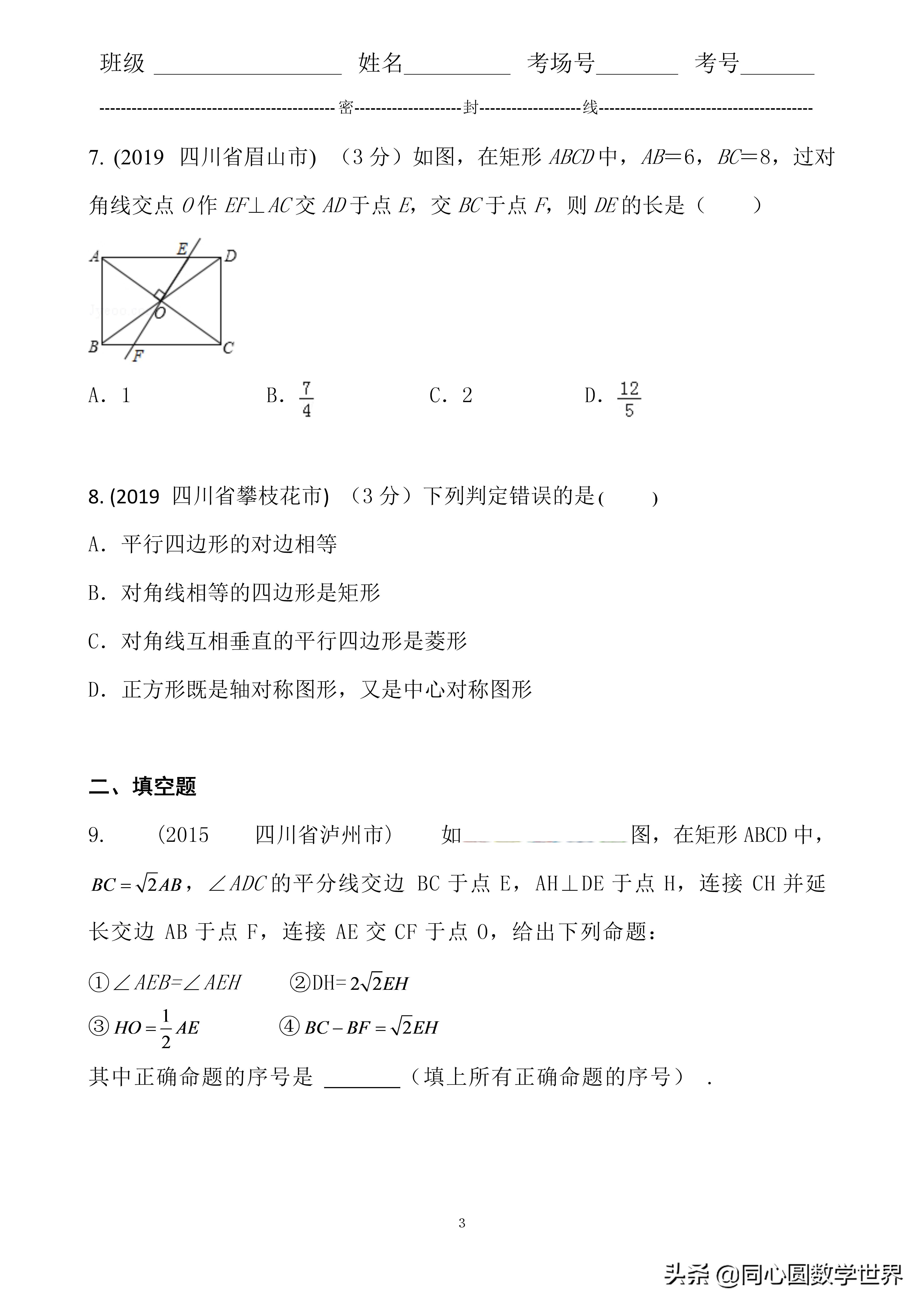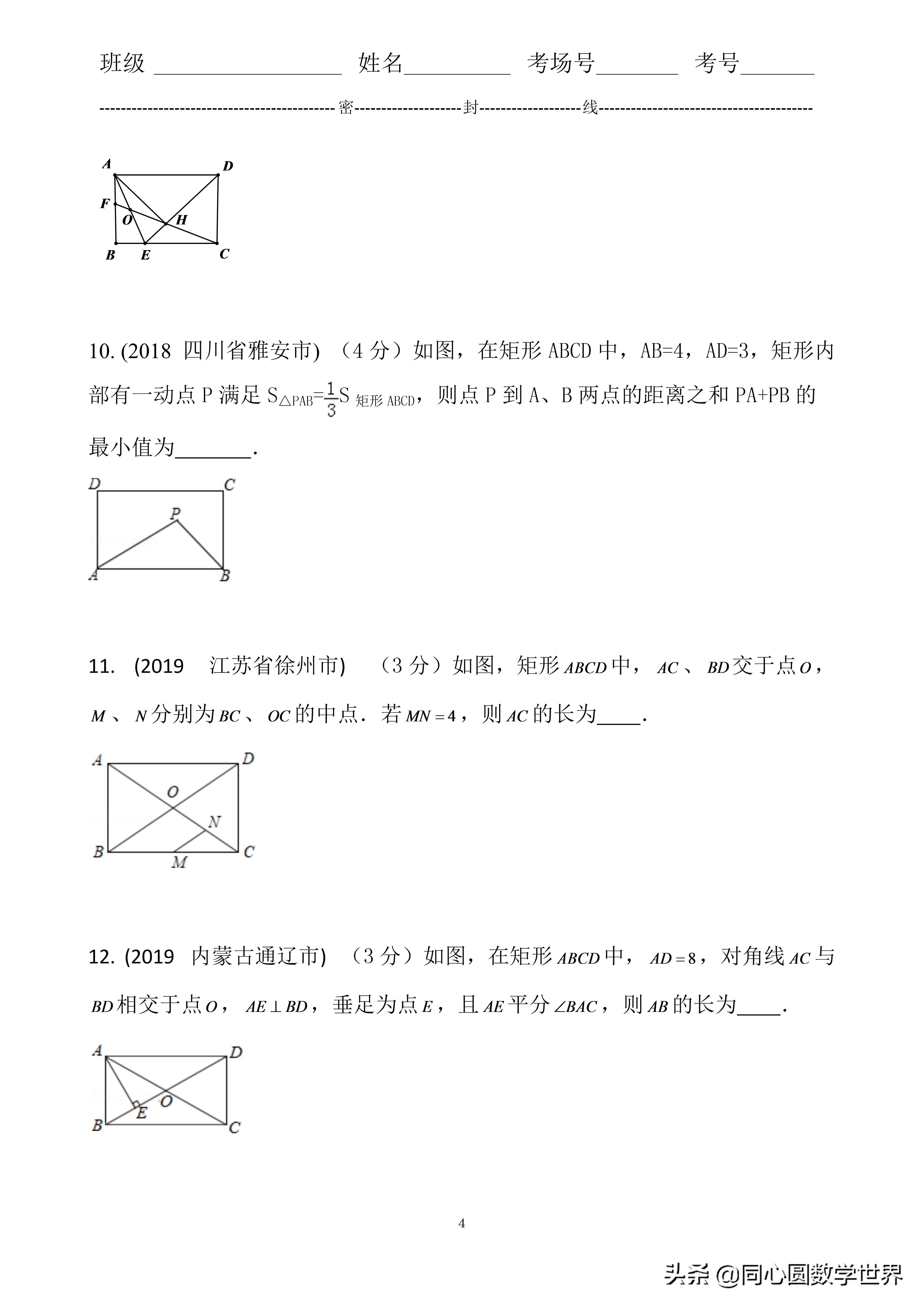 第9题则从矩形的性质,全等三角形的判定与性质,角平分线的定义,等腰三角形的判定与性质等方面进行了知识考查,熟记各性质并仔细分析题目条件,根据相等的度数求出相等的角,从而得到三角形全等的条件或判断出等腰三角形是解题的关键,也是解决与矩形有关的问题的难点。