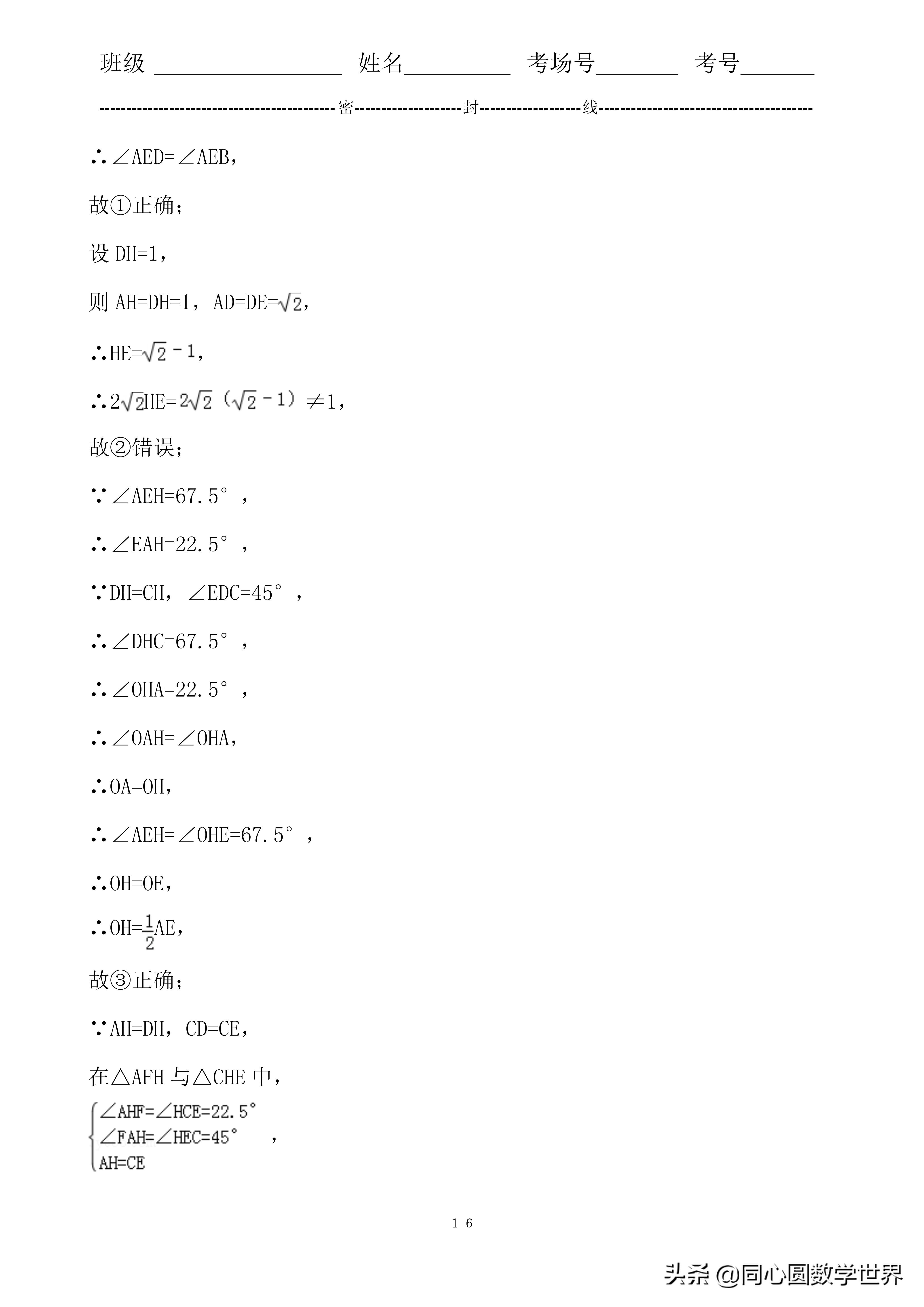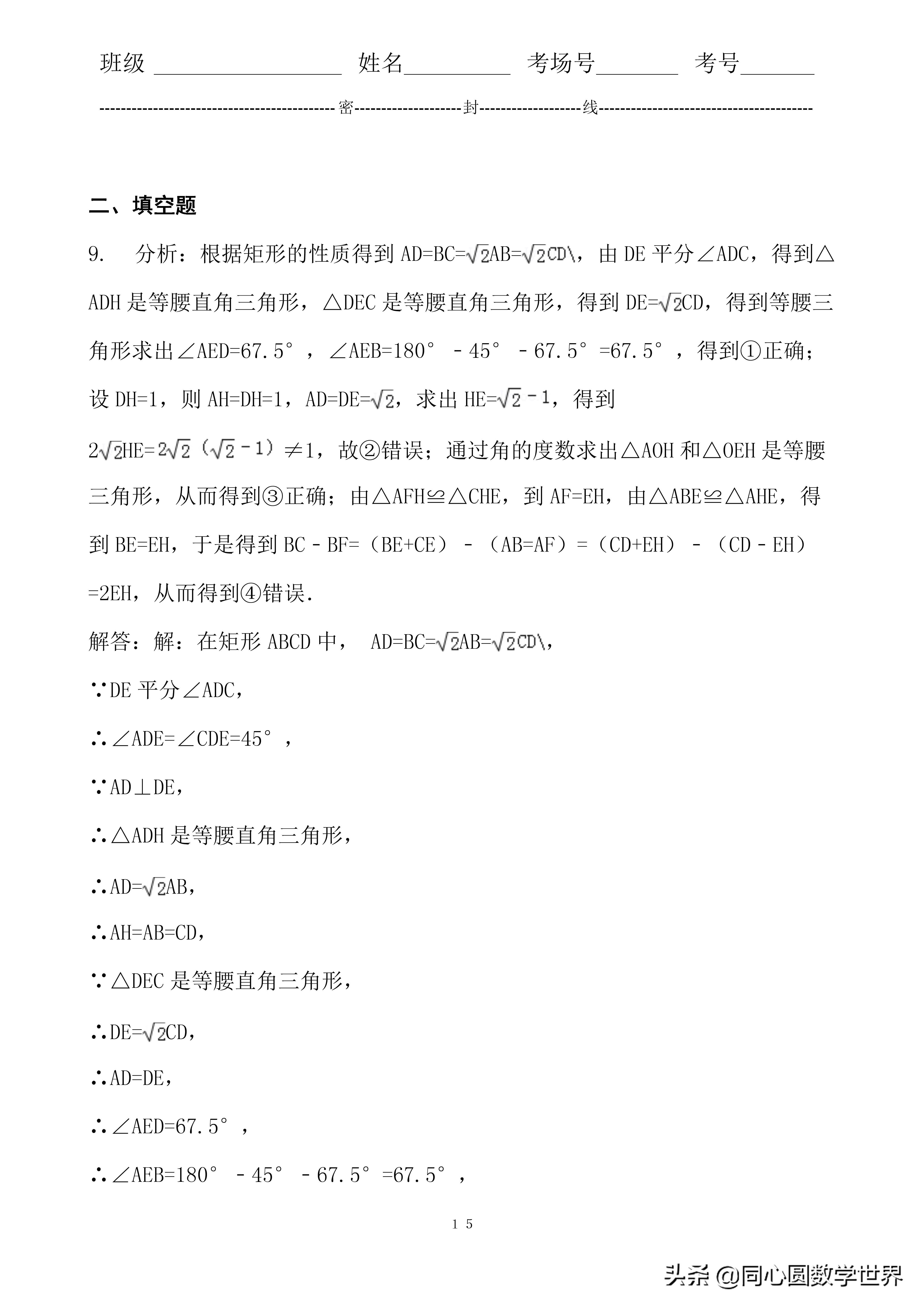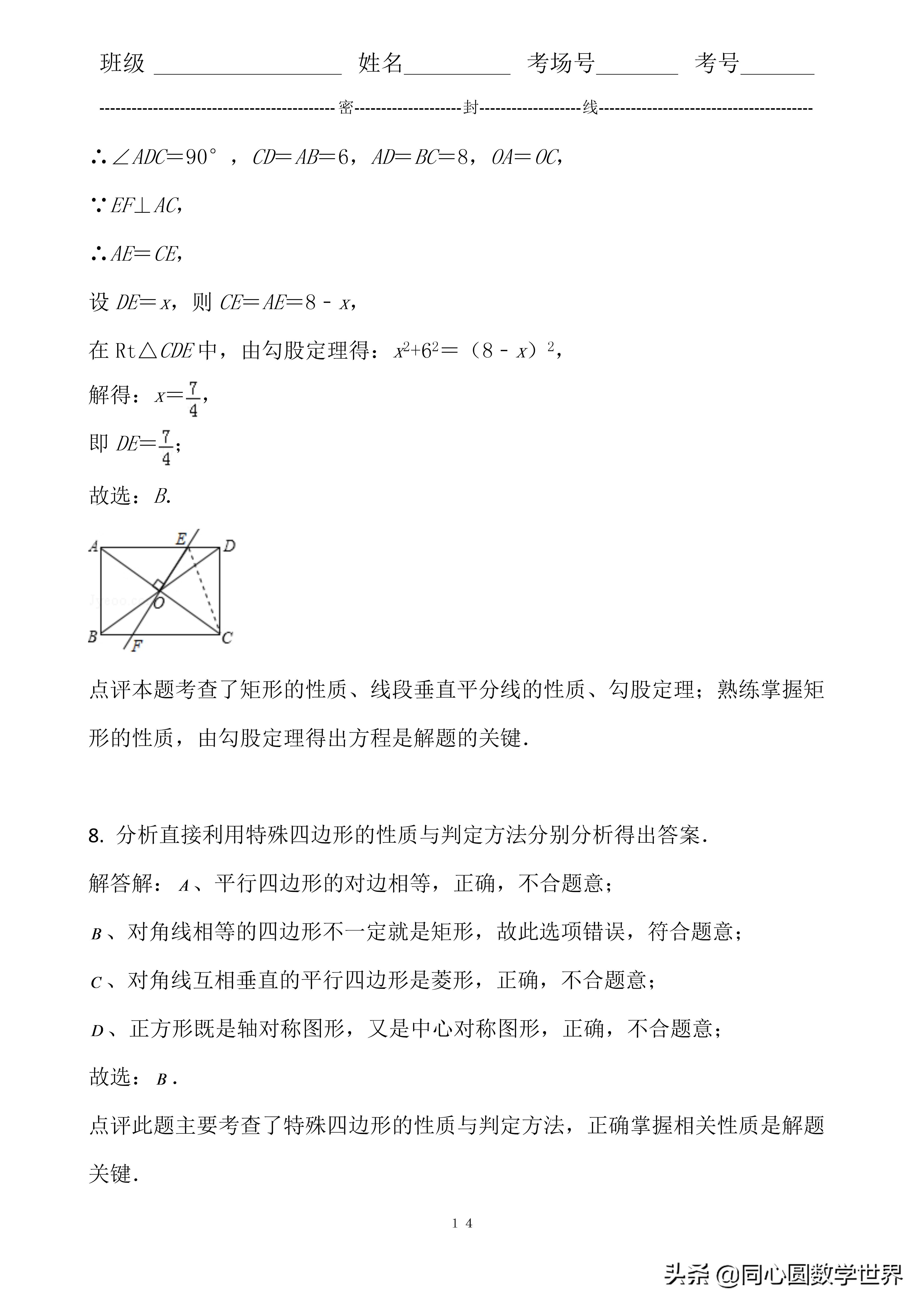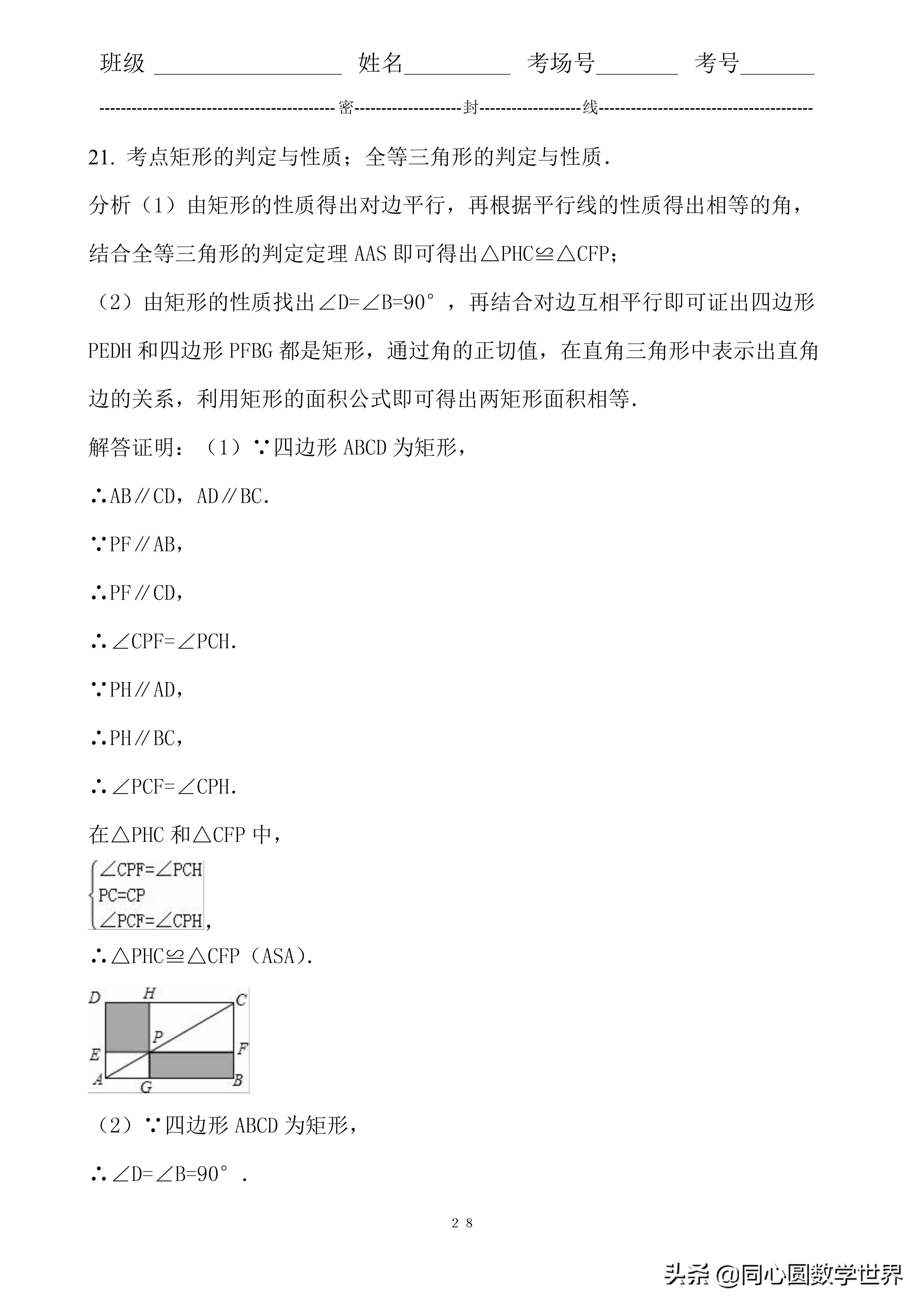 第9题则从矩形的性质,全等三角形的判定与性质,角平分线的定义,等腰三角形的判定与性质等方面进行了知识考查,熟记各性质并仔细分析题目条件,根据相等的度数求出相等的角,从而得到三角形全等的条件或判断出等腰三角形是解题的关键,也是解决与矩形有关的问题的难点。
