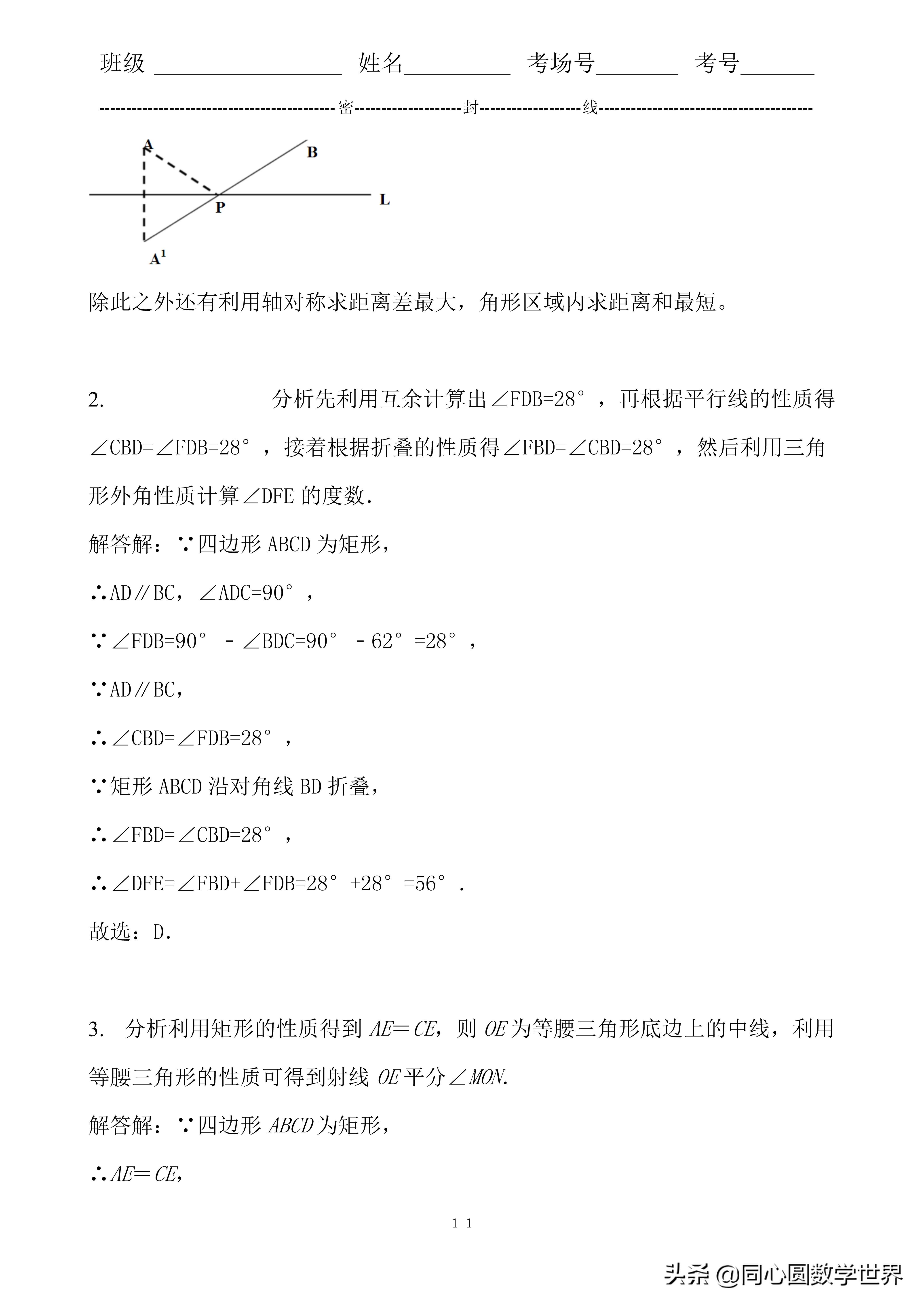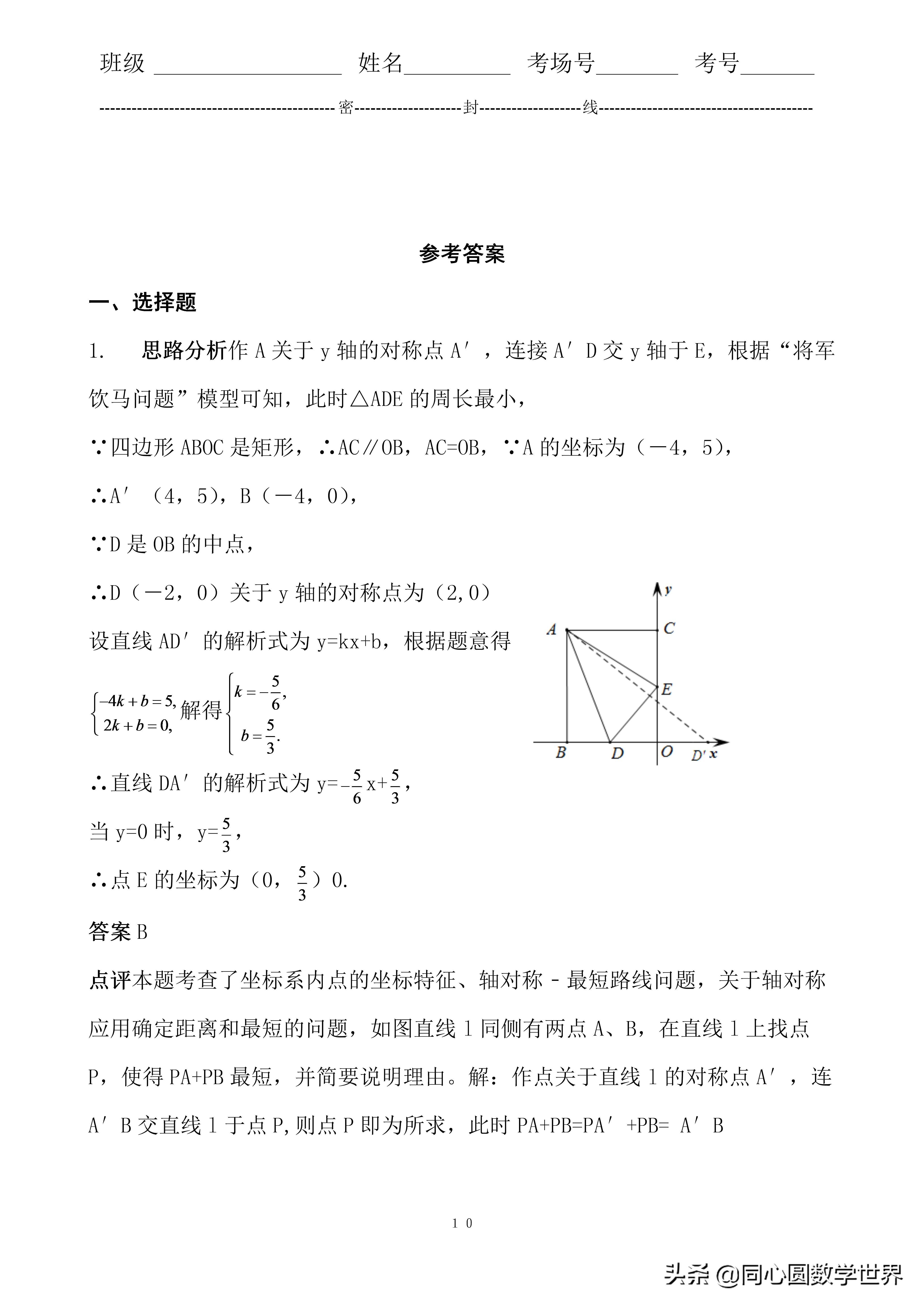 本单元对矩形的考查多是结合其他知识进行,独立考查的相对较少。比如第1题,将问题与“将军饮马问题”结合起来,模型可知,此时△ADE的周长最小,分别考查了坐标系内点的坐标特征、轴对称﹣最短路线问题,关于轴对称应用确定距离和最短的问题。除此之外还有利用轴对称求距离差最大,角形区域内求距离和最短。