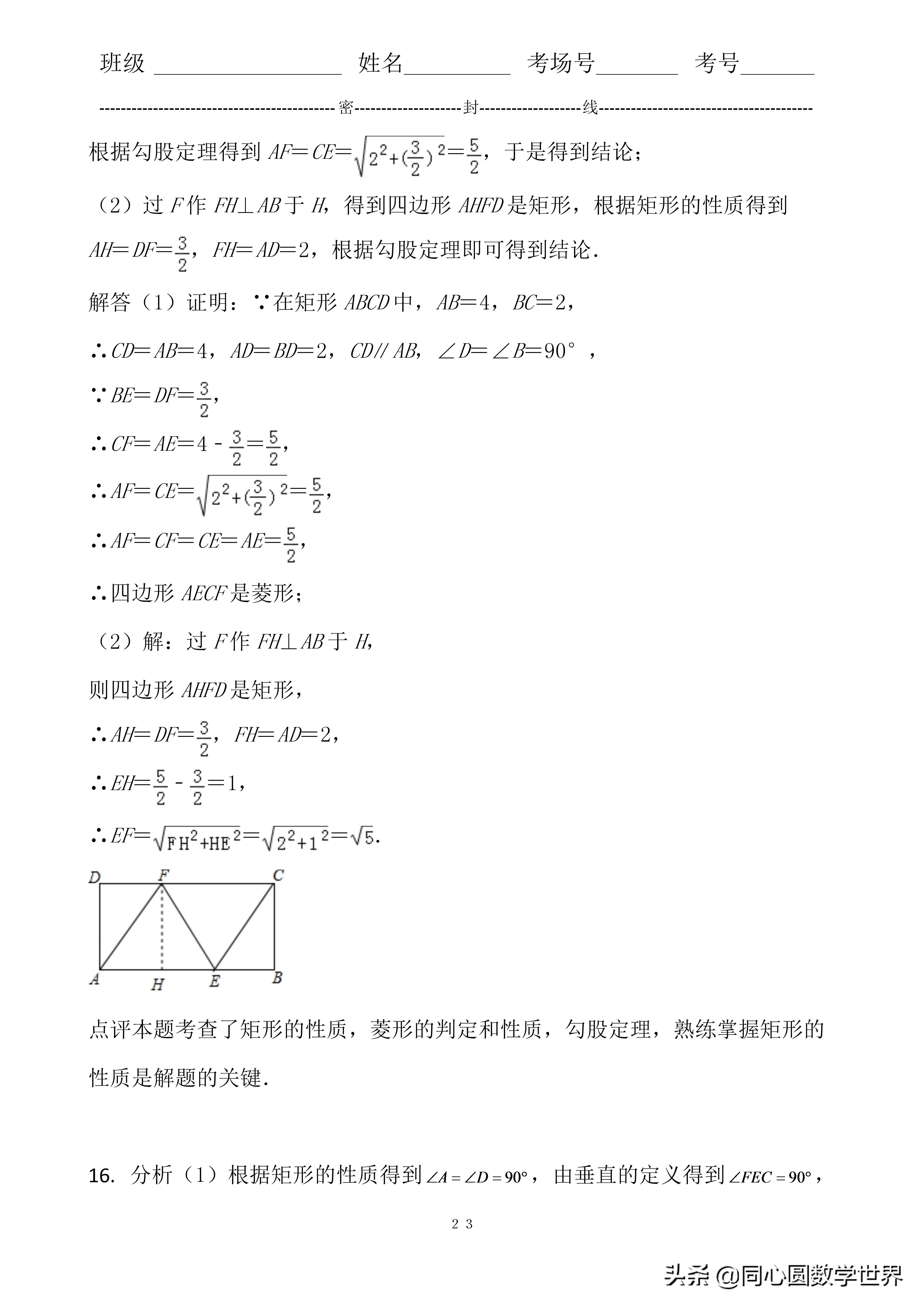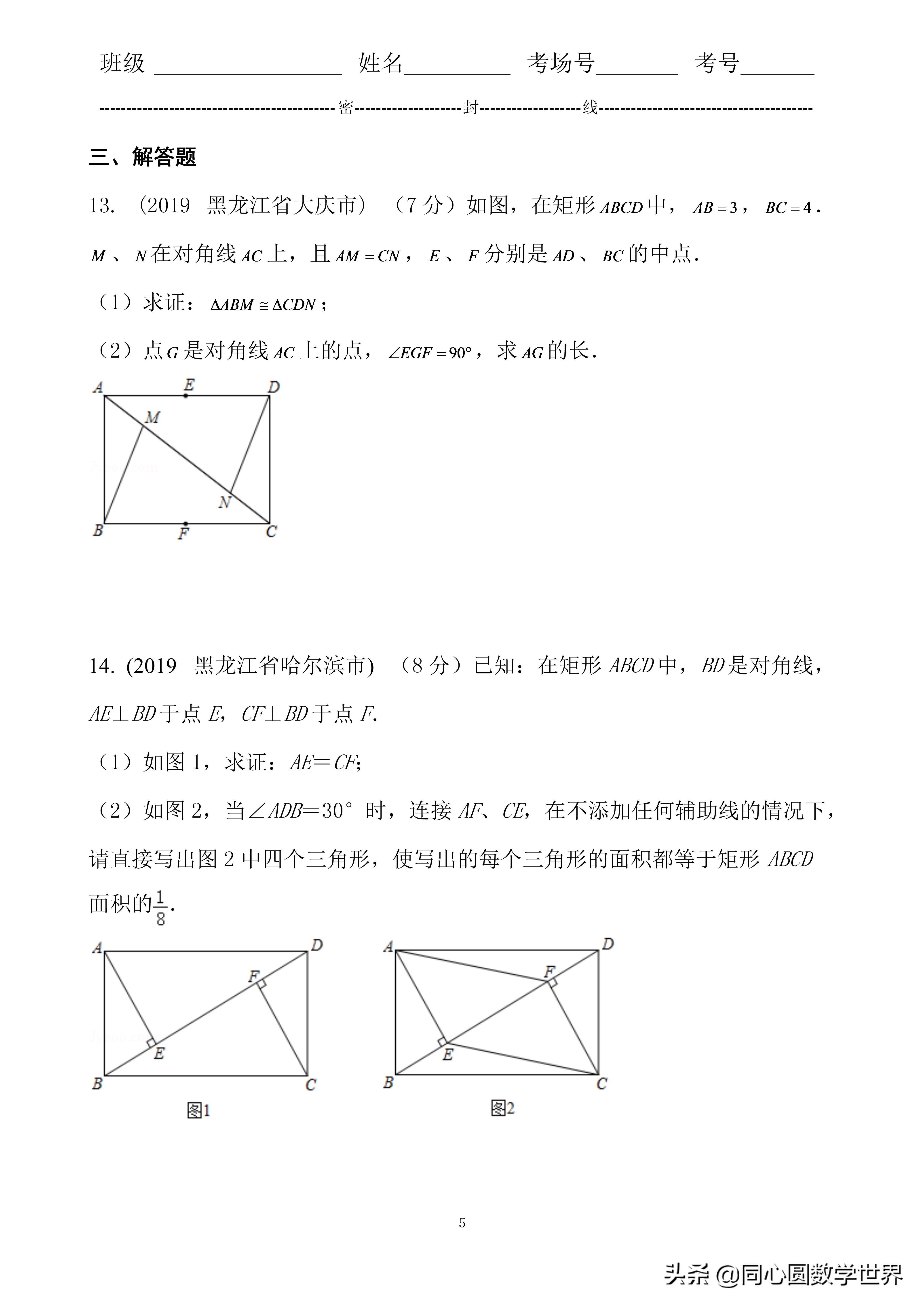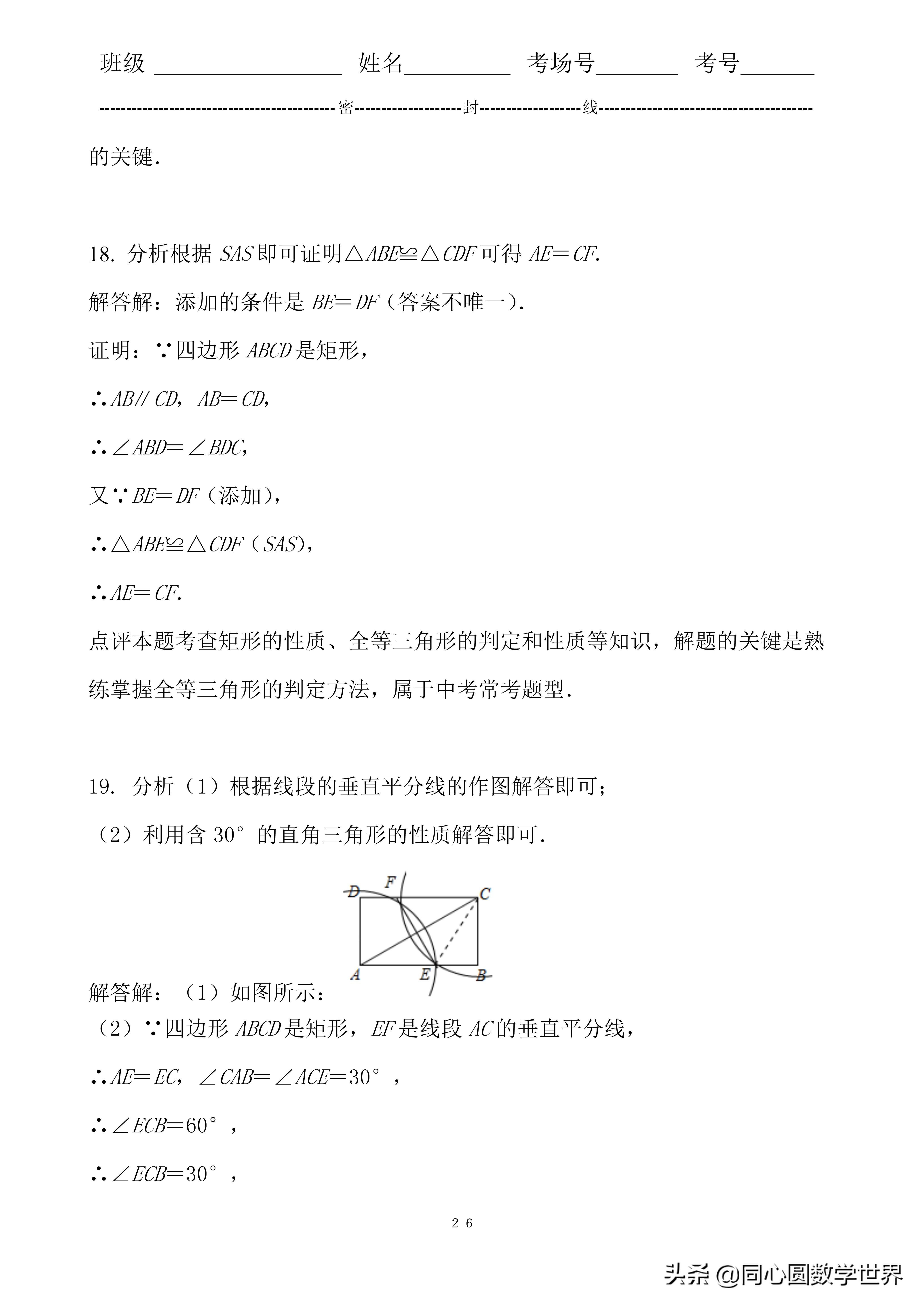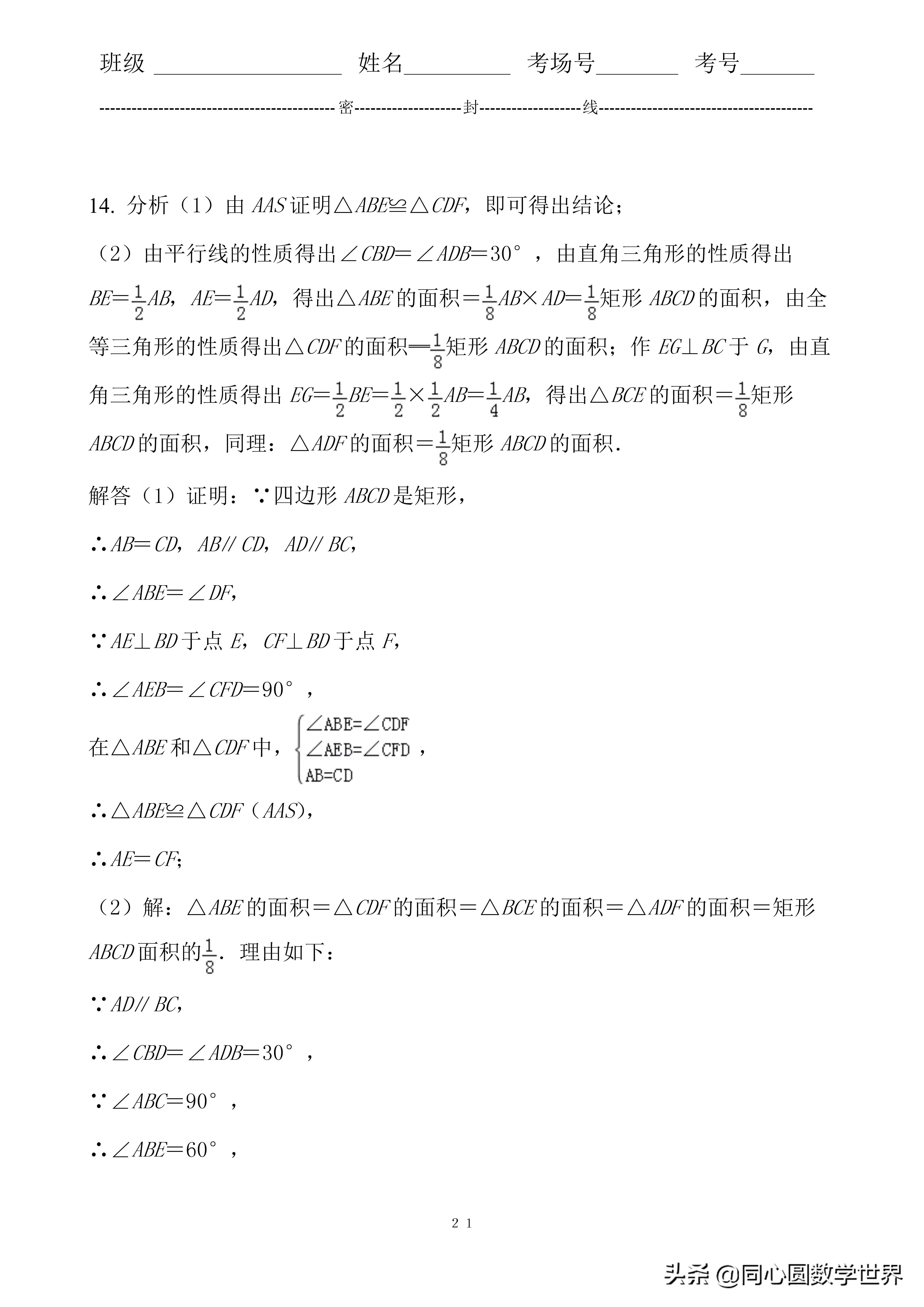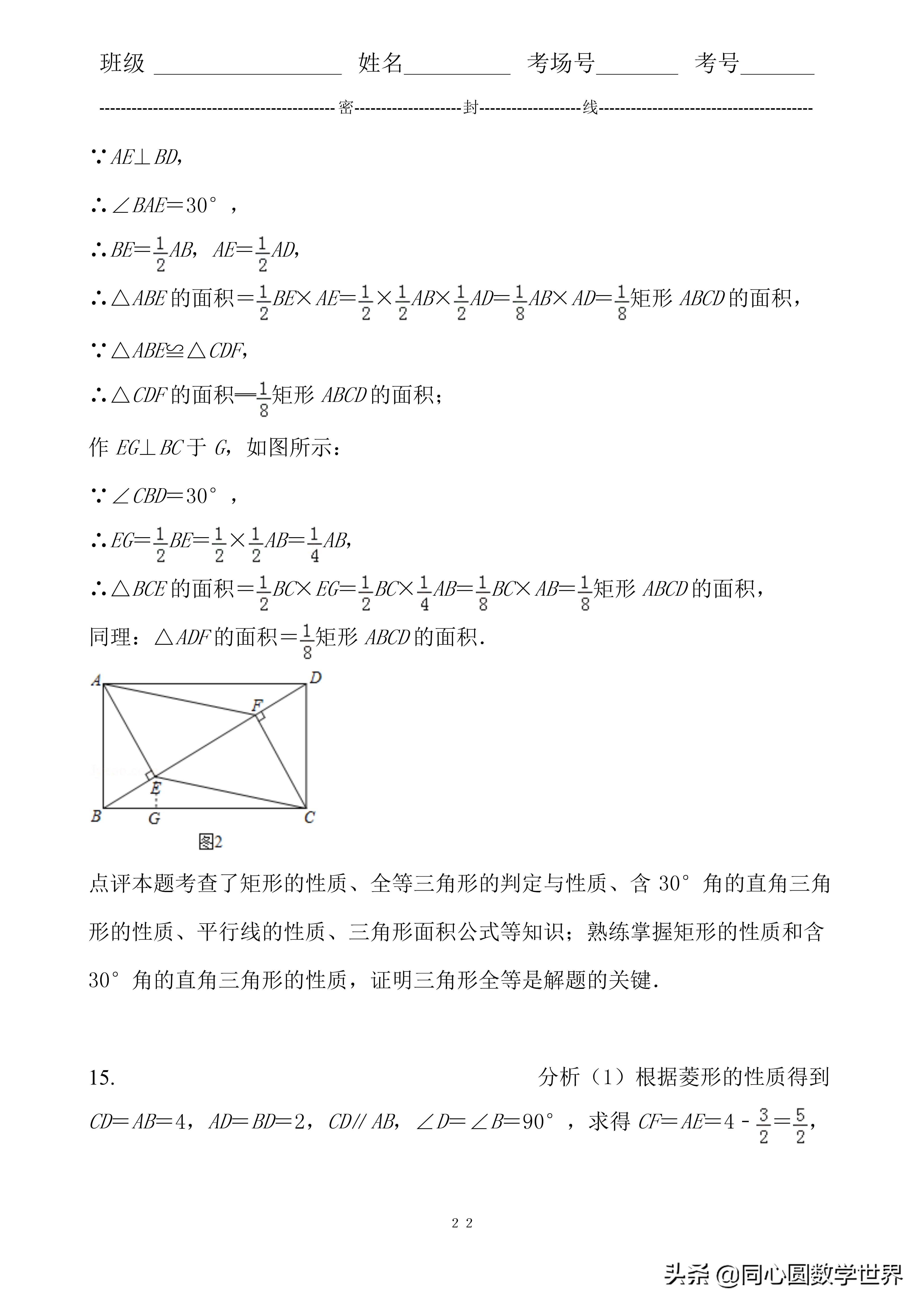 结合矩形的性质、全等三角形的判定与性质、含30°角的直角三角形的性质、平行线的性质、三角形面积公式等知识对考生进行考查,也是本单元中常见的考法之一,比如第14题。只要大家熟练掌握矩形的性质和含30°角的直角三角形的性质,然后选择合适的三角形证明全等是解题的关键。