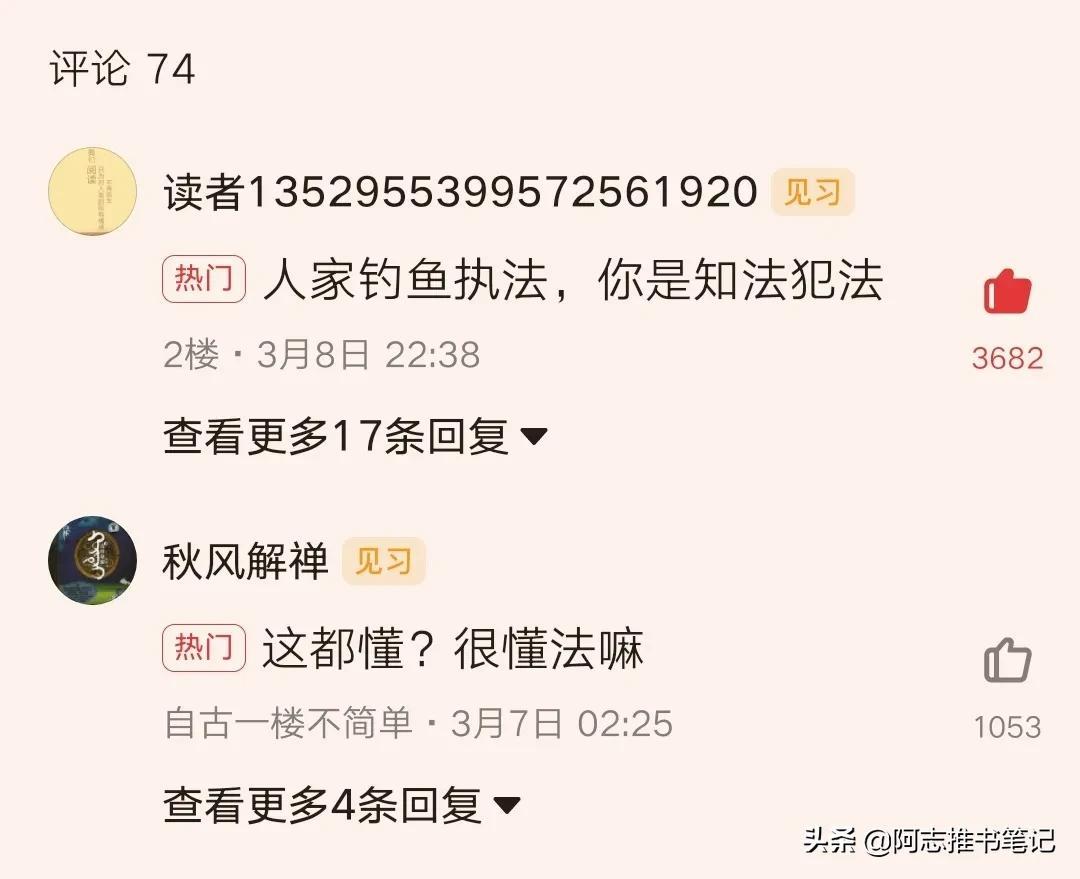 自古书评出人才!人家钓鱼执法,你是知法犯法啊!网友会说话就多说点!