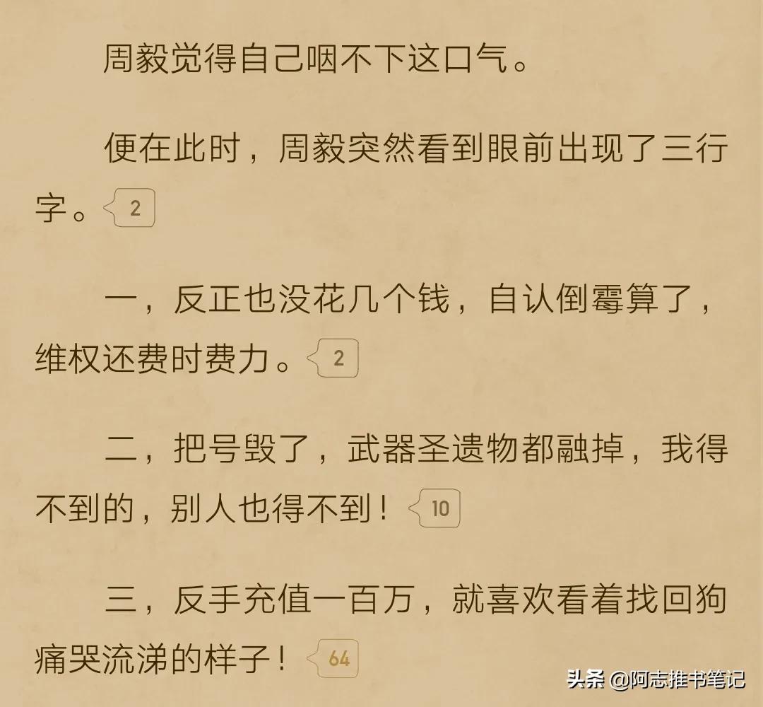 这本书通过主角开局账号被找回这个事件,开始进行让人身心愉悦的维权主线。世界上总是有那些逻辑奇怪的人,熊孩子身后总有熊家长说“他还只是个孩子啊”,就把孩子所犯的错掩盖过去,每每听了都让人血压上头。