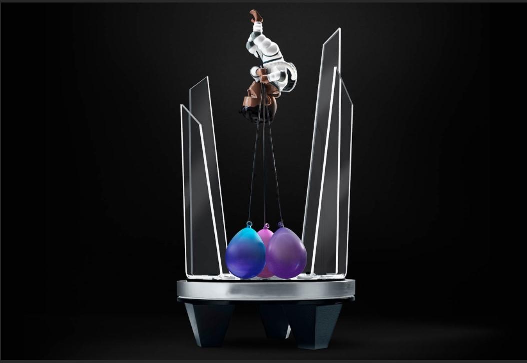 上图:这座14 英寸高的树脂雕塑在洛杉矶完工,通过倒立的宇航员角色表达了 Pharrell 对外太空的痴迷。作品的每一部分都是手工制作完成,气球的透明度和宇航员的背包,分别呼应了腕表的蓝宝石玻璃和酒桶形表身相对应