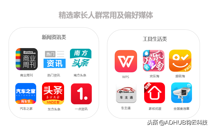 针对上述目标人群的移动偏好,ADHUB挑选出核心人群包(在线英语、儿童英语、考试英语、专业英语、商务英语)、相关人群包(亲子娱乐、兴趣培养、小升初、招聘、应聘、升职培训…)、扩展人群包(汽车房产、金融理财、购物生活、休闲旅行类),地域定向:主打一二线城市、覆盖三四线注重英语教育培训的城市,按照这些策略筛选出一批媒体与目标人群进行精准匹配。