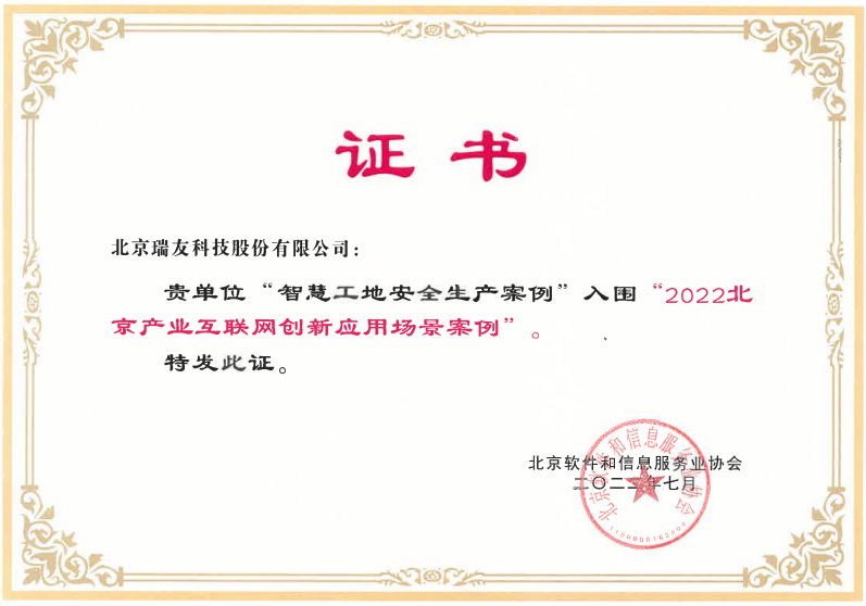 北京软件和信息服务业协会在论坛发布了《2022北京产业互联网创新应用场景案例》等重磅成果。案例涵盖服务业互联网、工业互联网、农业互联网和治理互联网四大方向,瑞友科技的智慧工地安全生产案例入围工业互联网创新应用场景案例。