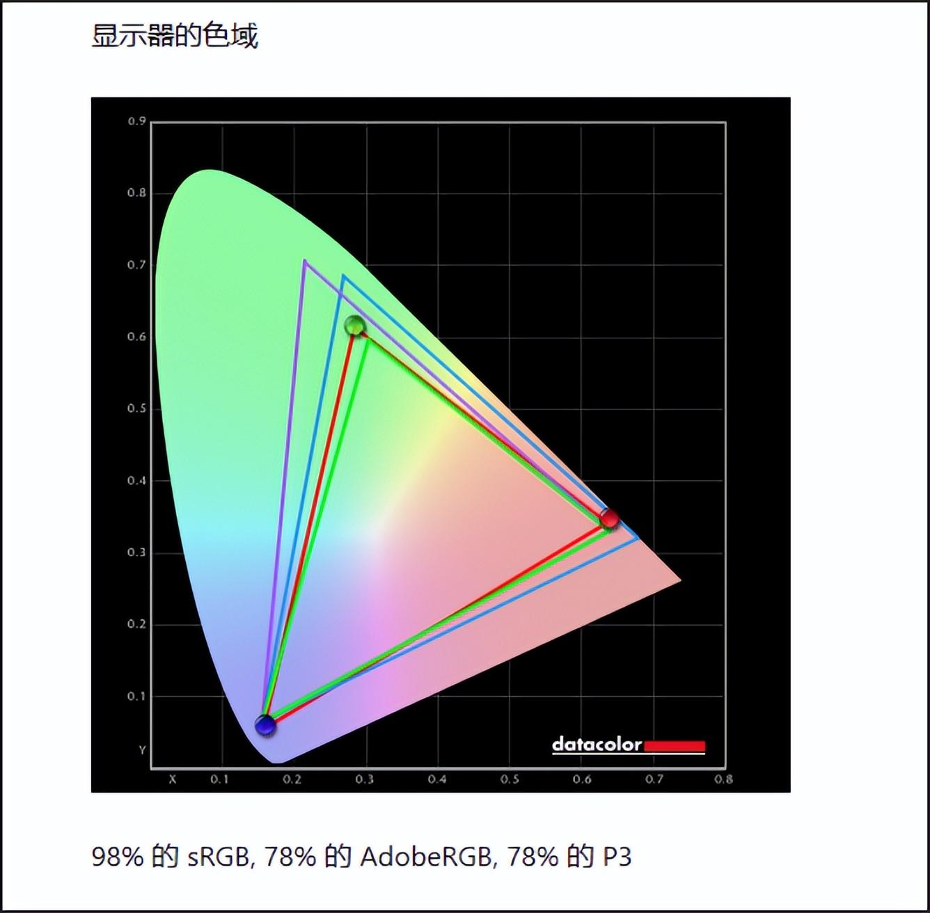 从校色仪测试来看,评测机型屏幕实测为98%sRGB、78%P3色域。色准方面,48色测试中,其DeltaE最大值为6.8,最小值为0.21,平均值为0.85,应对常规的修图或者照片处理没什么问题。