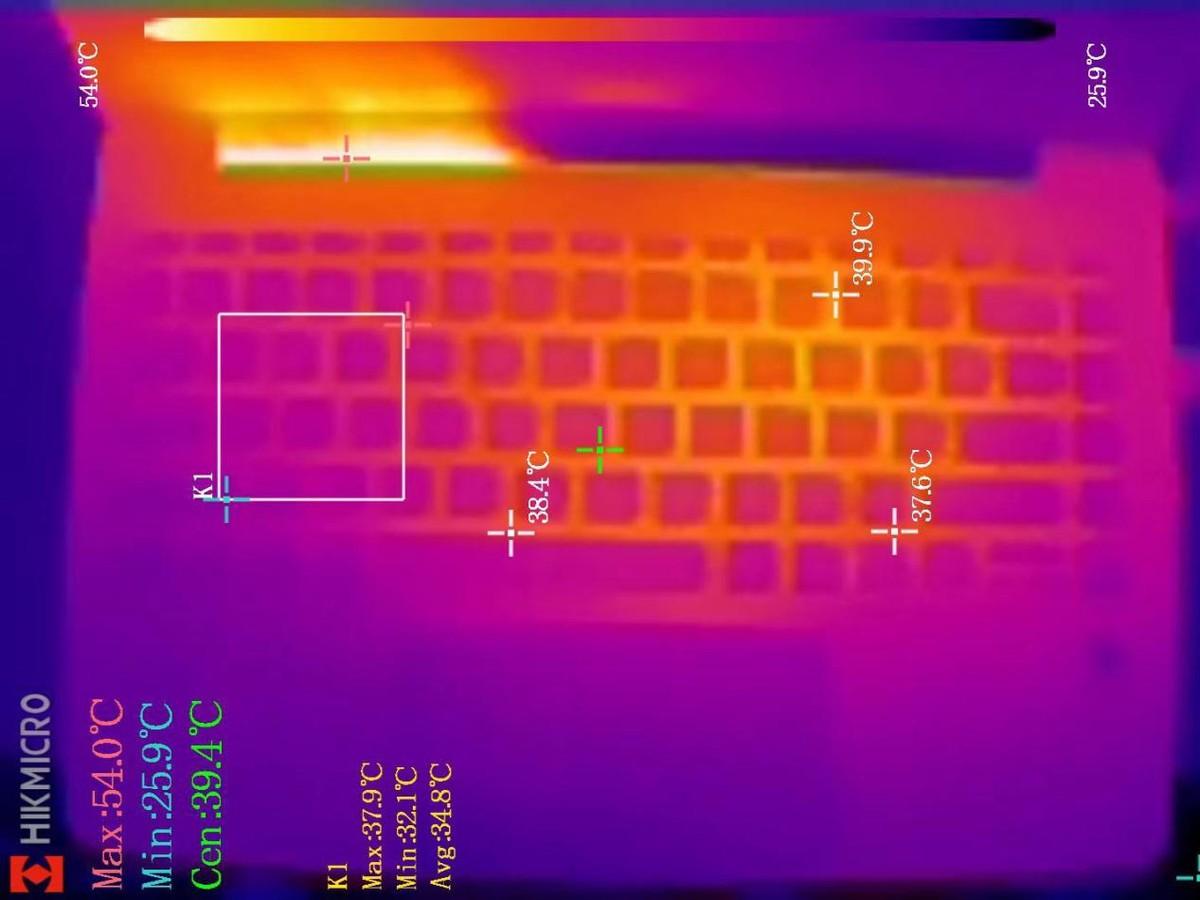 表面温度和噪声分析:战66五代酷睿版的隔热做得不错,在考机30分钟后的满载状态下,C面的热成像图如下所示:热量集中在机身右上区域字母按键P附近,最高温度约40℃,此区域微有热感,W、A按键区域在30℃附近,腕托和触控板位置就更低了,控制在30℃内,凉爽。总体上操控区域基本没热感,右上区域能感觉到较低的热量。而这还是在比较闷热的办公室环境下考机的温度,如果开启空调,那么C面温度会更低一些。当然,这个表现已经强于绝大多数金属C面轻薄本了。