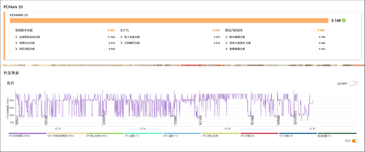 ▲PCMark10的测试,总体分数为5149,对于轻薄本来说比较高,日常应用轻松运行。