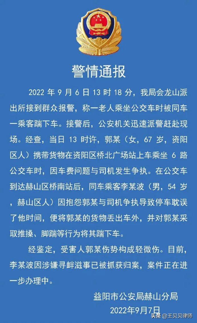 在公交车到达赫山区桥南站后,同车男乘客李某波(男,54岁)因不满老人与司机争执导致停车耽误了他时间,便将老人的货物丢出车外,并连推带踹的将老人赶下公交车。