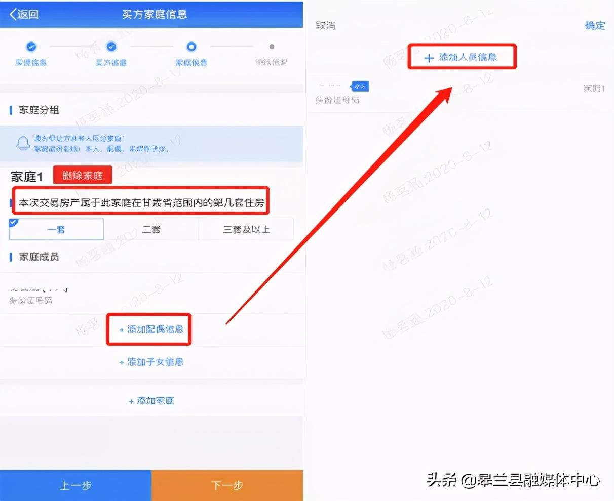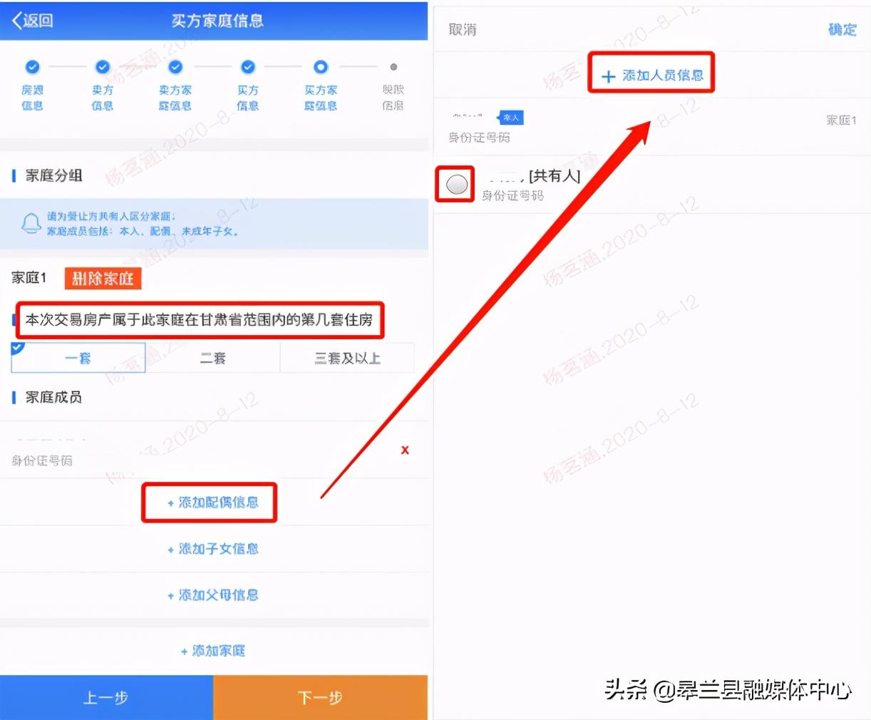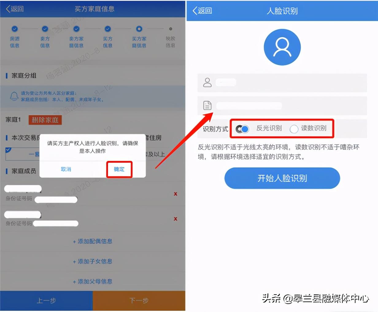 在“家庭信息”页面,可点击【添加配偶信息】-【添加人员信息】进行添加配偶信息,也可通过【添加子女信息】-【添加人员信息】进行添加子女信息,选择房屋套次,点击【下一步】页面弹出提示信息:“买方主产权人进行人脸识别”,点击确定进入人脸识别界面。