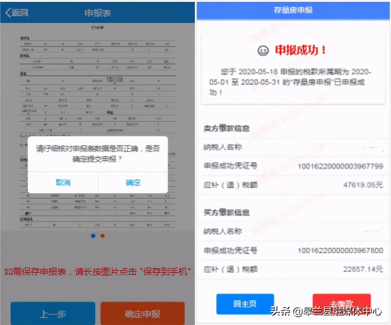 在“申报表”页面,点击【确定申报】,出现提示“请仔细核对申报表数据是否正确,是否确定提交申报?”,点击【确定】进行申报。在“存量房申报成功”页面,点击【去缴款】,进入“税费缴纳”页面。