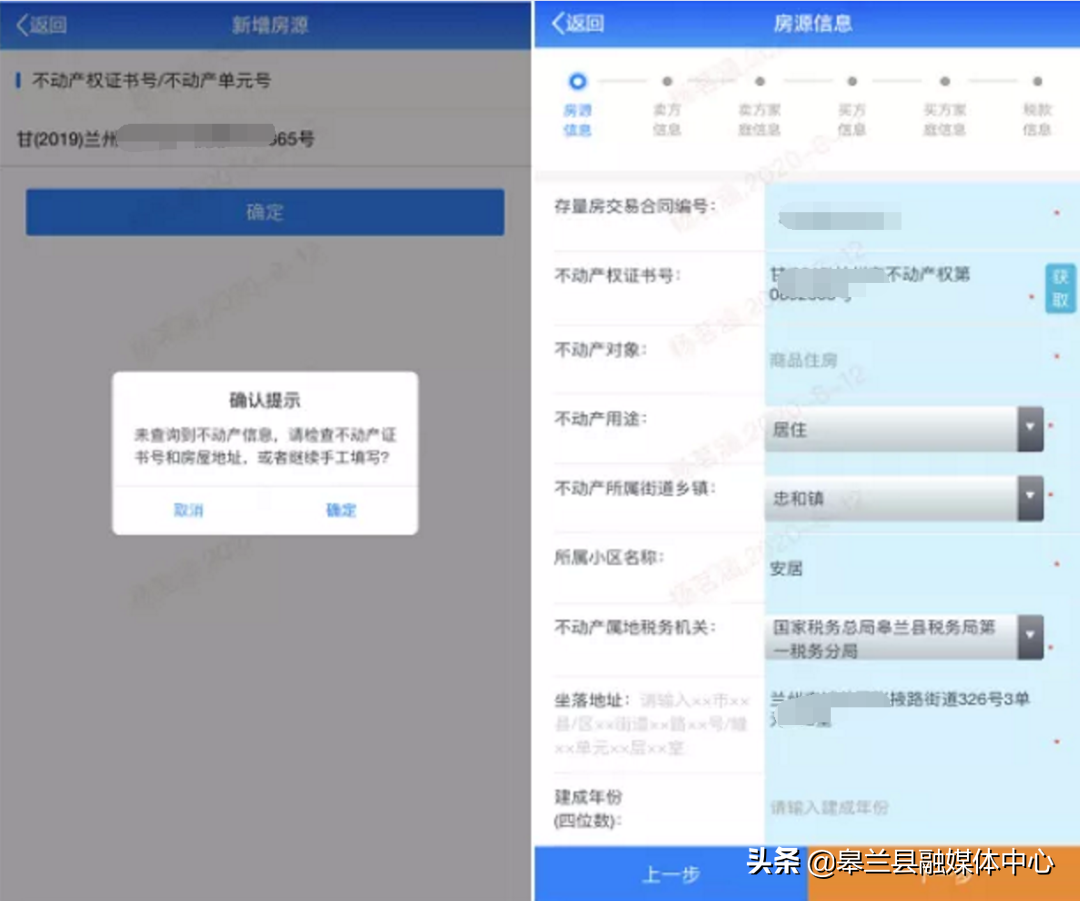 输入不动产权证书号或不动产单元号进行查询,无法获取到不动产信息的可手工录入房源信息及合同信息,其中“所属小区名称”一定填写正确,便于税务人员核税。