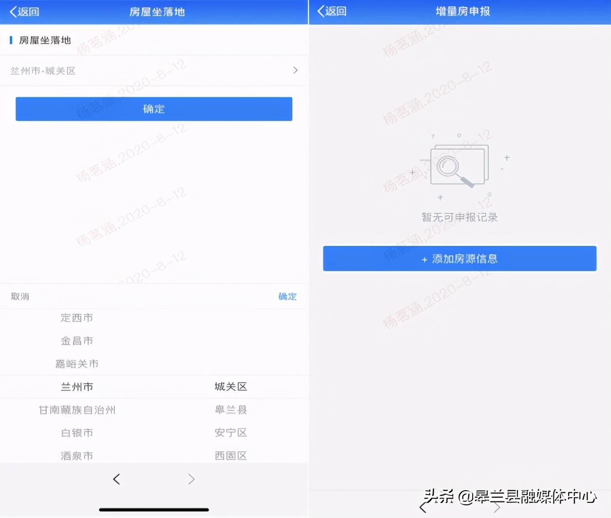 在“房屋坐落地”页面中,自动默认带出身份证信息所在地区,外地身份证号默认兰州市城关区,可根据当前交易房屋所在地选择,点击【确定】进入“增量房申报”房源信息展示页面。