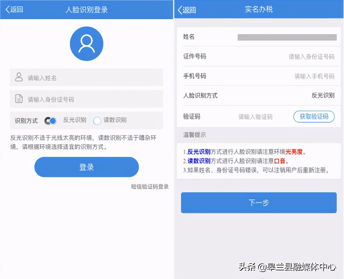 实名认证时需输入身份证号码、姓名以及手机号码,进行人脸活体实名认证,实名认证完成后可进行办税的相关操作。注:识别方式可选择反光识别或读数识别两种方式。