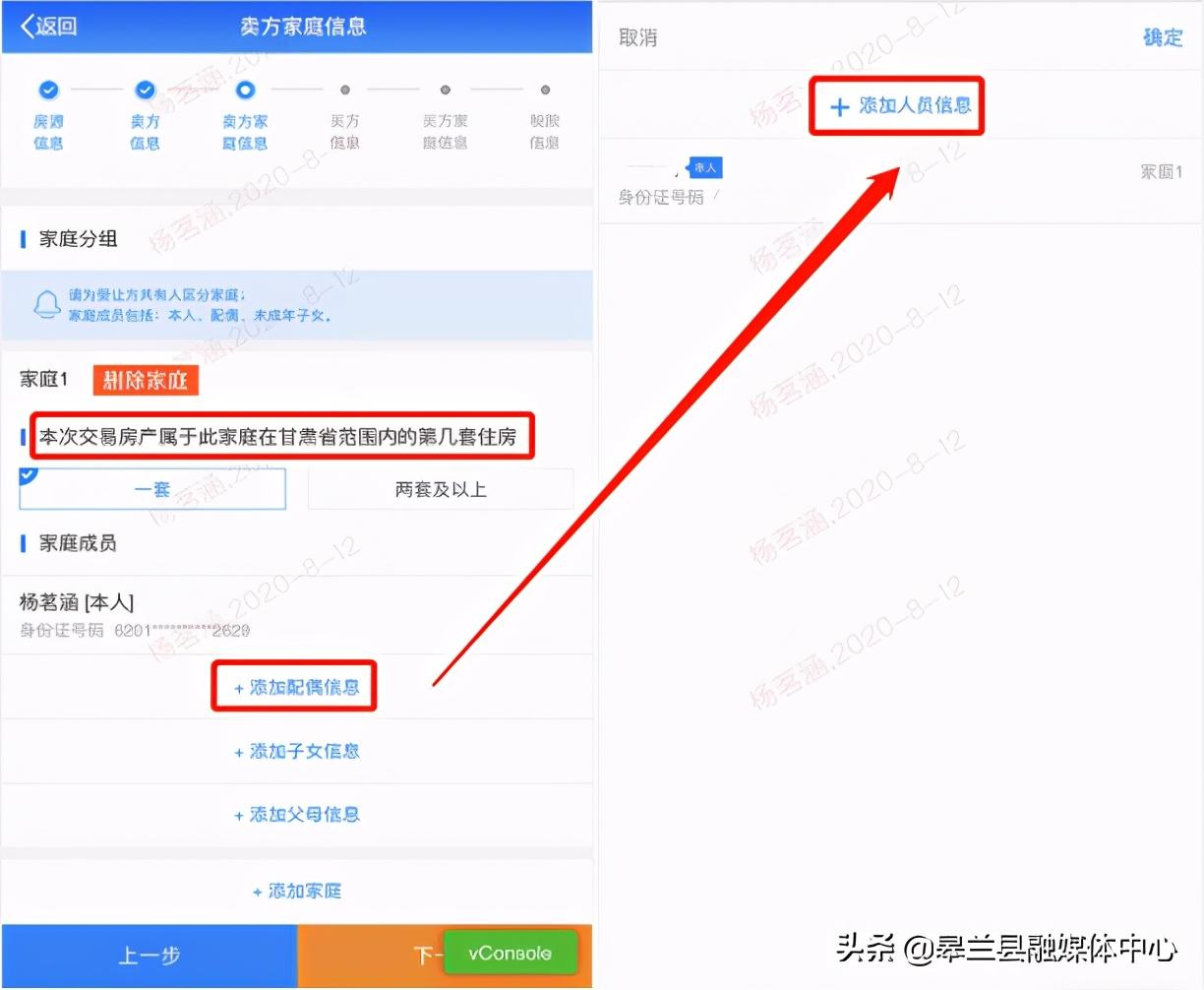 在“卖方家庭信息”页面,可点击【添加配偶信息】-【添加人员信息】进行添加配偶信息,也可通过【添加子女信息】-【添加人员信息】进行添加子女信息,选择房屋套次,点击【下一步】进入“诚信保证书”页面。