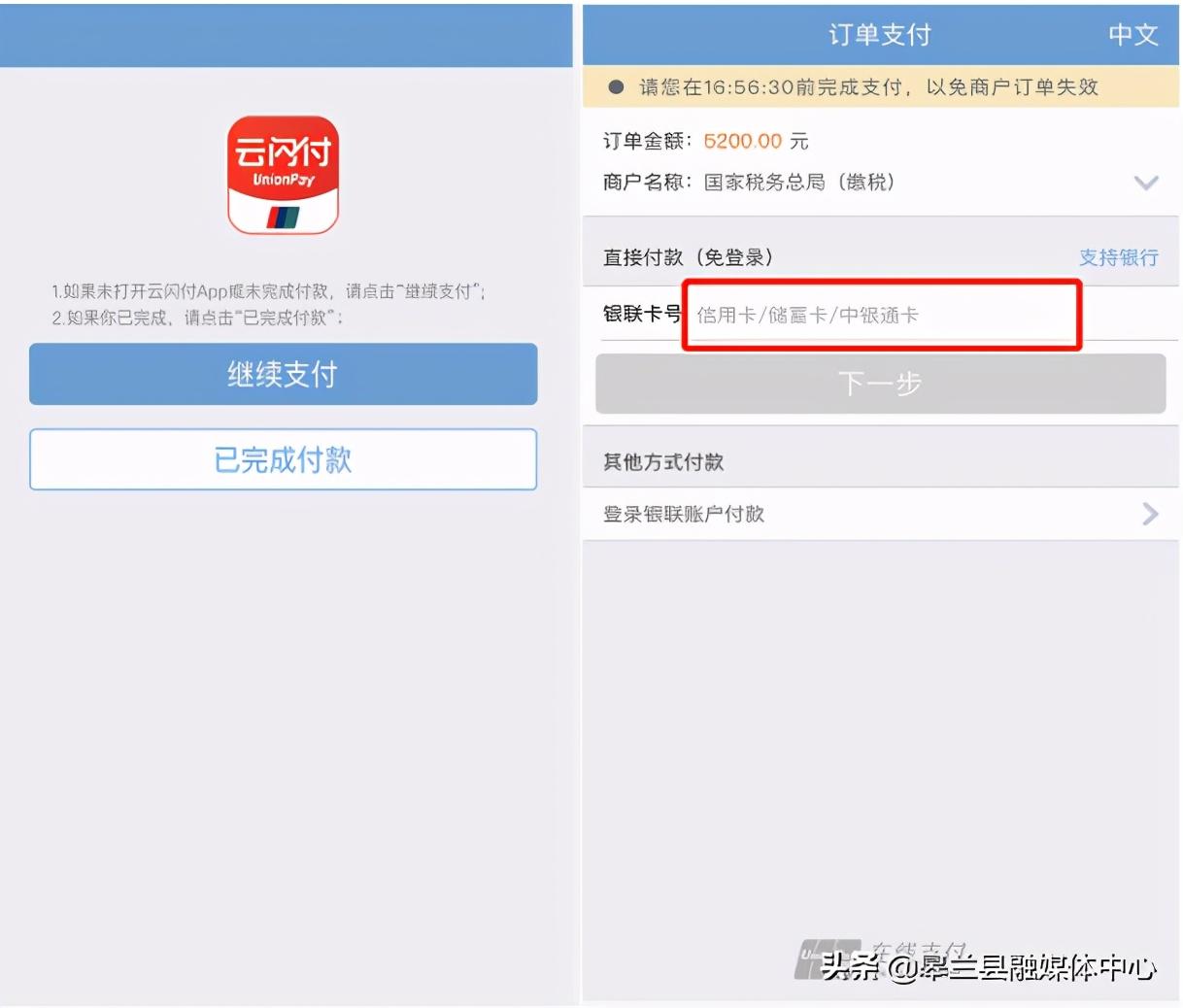 在申报成功界面点击【去缴款】或直接进点【税费缴纳】模块进入,勾选待缴款的信息,点击【下一步】“选择缴款渠道”页面选择长按识别二维码支付或点击【云闪付】,出现提示点击【确定】可进行支付。