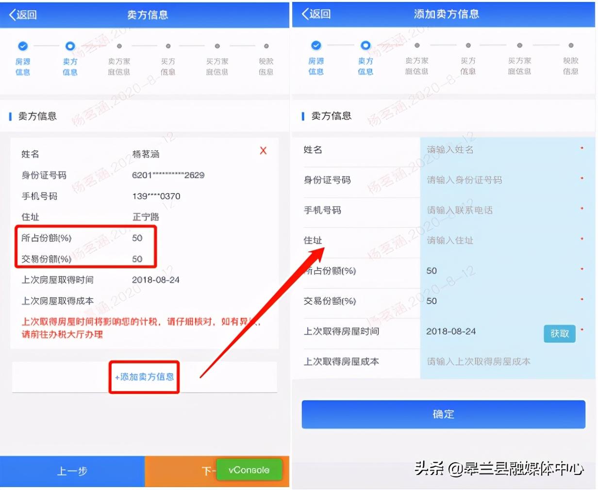 完善卖方信息:手机号码(用作审核完成后接收短信)、地址、份额(所占份额和=100)、 确定上次取得房屋时间。若有共有人,则需点击“添加卖方信息”按钮增加人员信息,所占份额按照实际情况分配填写,份额不能为0,共有人份额相加=100。