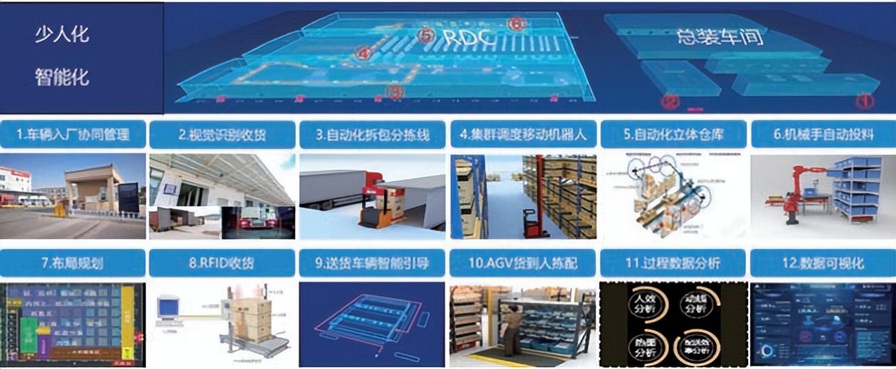 在吉利汽车焊装车间应用AGV实现了无人化线边配送,且可实现无灯作业,大大提升了线边配送效率与质量,同时还降低了能耗。