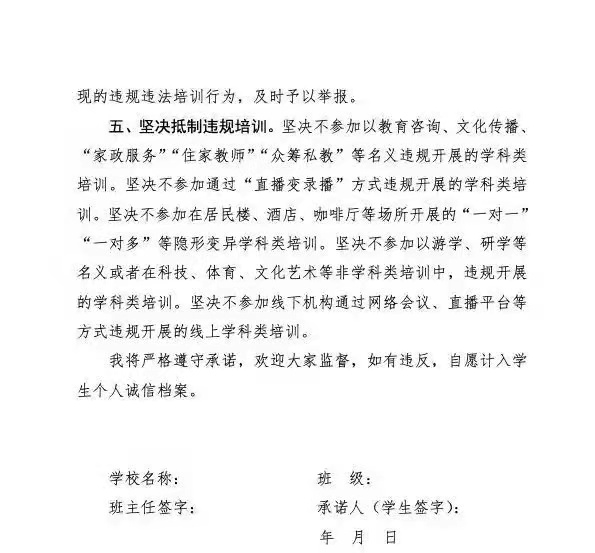 近日,河南教育厅下发文件,让中小学生集体签署“承诺书”,承诺拒绝参加学科类培训,拒绝参加任何补课行为,违者将被纳入个人诚信档案中。一旦学生的诚信档案有了污点,我们都知道,以后考研、考公务员、甚至购房购车都会受到影响。