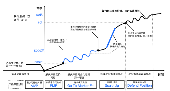 PMF:产品市场契合点,解决产品定价问题,能够成功获得第一批客户,但获客成本极高。作为产品经理要深入参与到第一批获客中,了解第一批客户为什么要购买我们产品,产品价值是如何传递给我们客户,甚至我们还要进行产品实施,帮助客户用起来。产品经理这时候要谨慎扩张,围绕核心功能不断完善我们的产品。