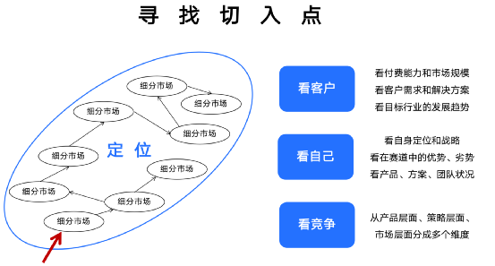 有了产品定位后,在市场竞争中如何寻找突破口呢?产品一开始不建议大开大合,一定要从某个细分市场切入,细分市场切入要看客户、看自己、看竞争,才能找到合适的切入点。如钉钉诞生之初,利用IP免费电话工具,获得一批电商客户,恰好当时电话费用比较贵,IP电话能为电商企业节省不少费用高。
