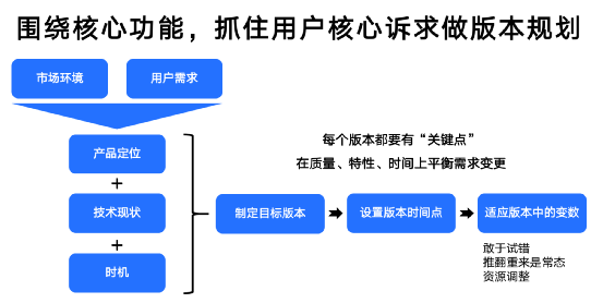 制定版本目标,希望每个大版本有响亮的名字,让团队中每一个人都清楚了解所要做内容及目标,也能激励团队,向目标前进;设定版本时间节点,根据制定时间计划要有效推进,按计划按要求落实,大版本上线后团队可举行一些庆祝;适应版本中的变化,敢于试错,快速响应解决,甚至推翻重来,资源根据情况调整。